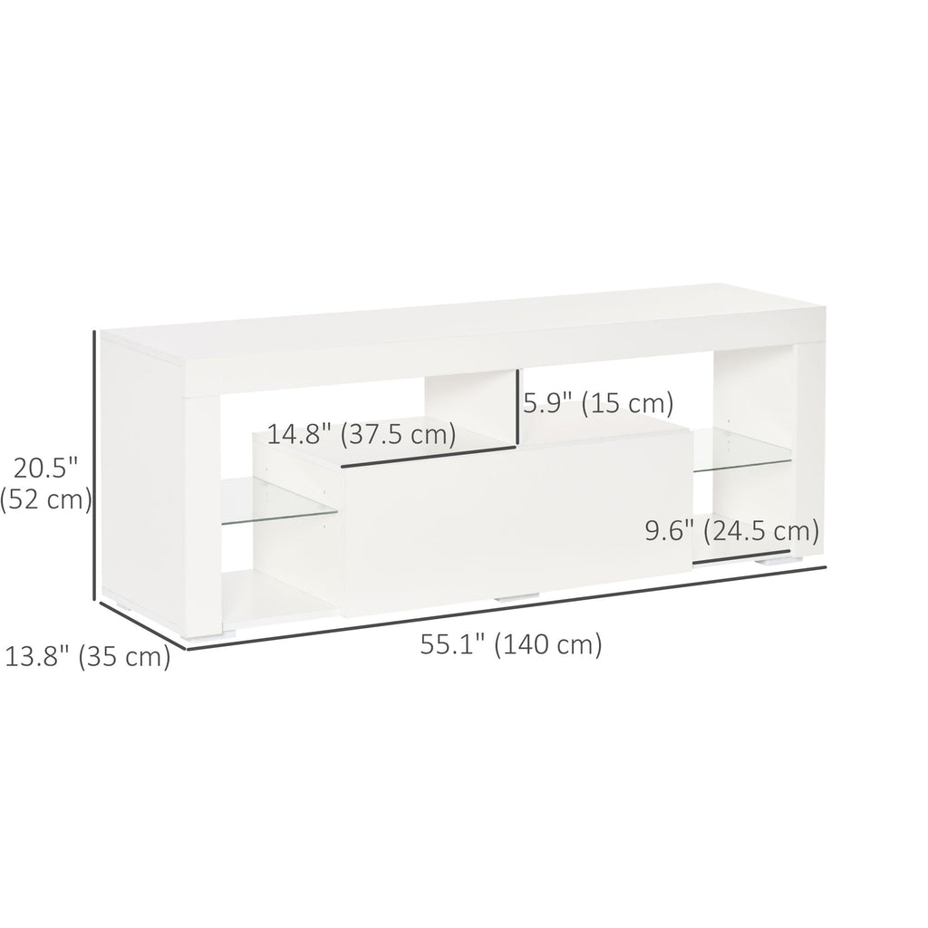Enhance your living room with this modern TV unit featuring dazzling RGB LED lights and a high gloss design that will elevate the ambiance of any space. With a 55-inch desktop, it's the perfect size for TV screens ranging from 32 to 50 inches, providing a stylish and functional base for your entertainment setup. The media cabinet includes 6 shelves and a large drawer, offering ample storage for remotes, game controllers, and media devices, while the adjustable shelf allows for flexibility to meet your storage needs. The LED lighting on the glass shelves creates a mesmerizing effect, with 20 RGB colors, two lighting speeds, six lighting modes, and customizable DIY buttons to personalize your lighting experience. Constructed with high-quality particle board and PVC foot pads for enhanced stability, this TV unit is built to last and is perfect for modern homes.
