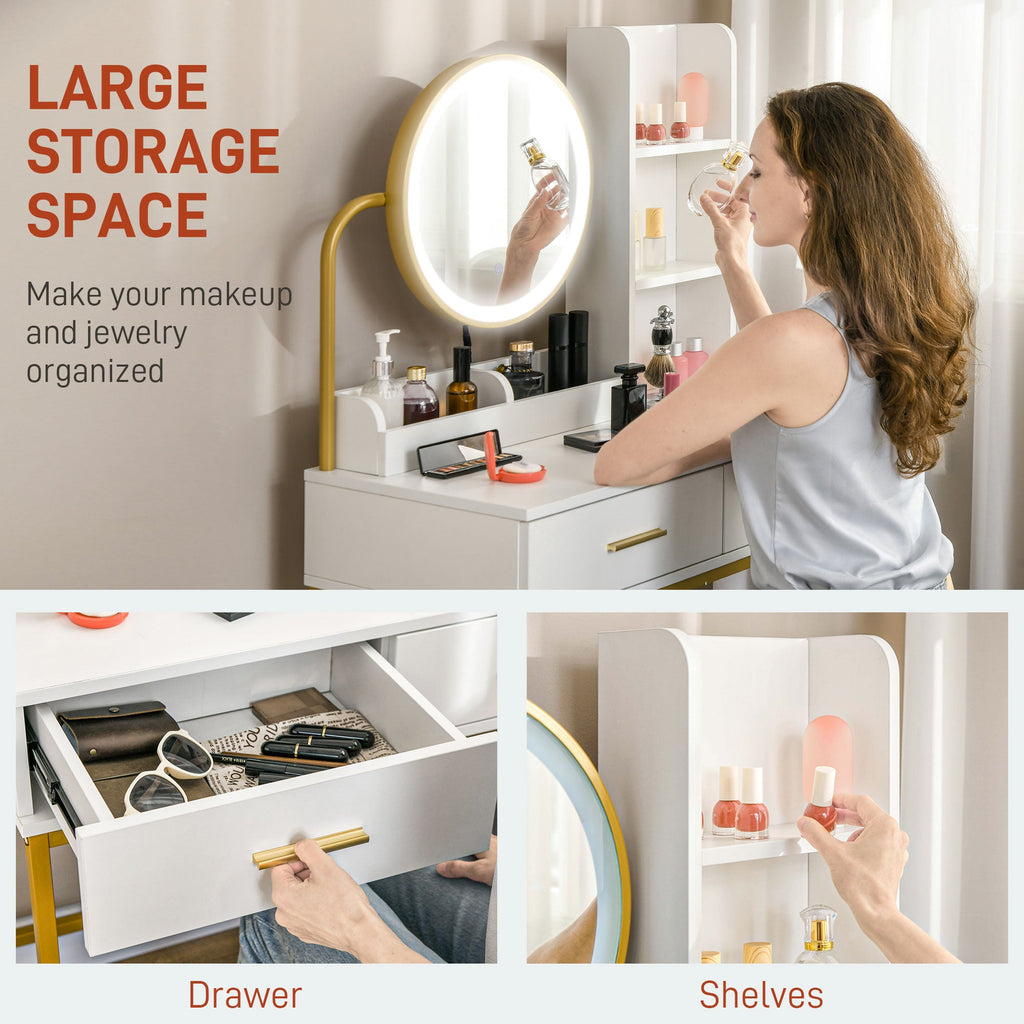 Illuminated Beauty Station: Features a large round mirror with a white LED light strip and touch sensor for optimal makeup application.