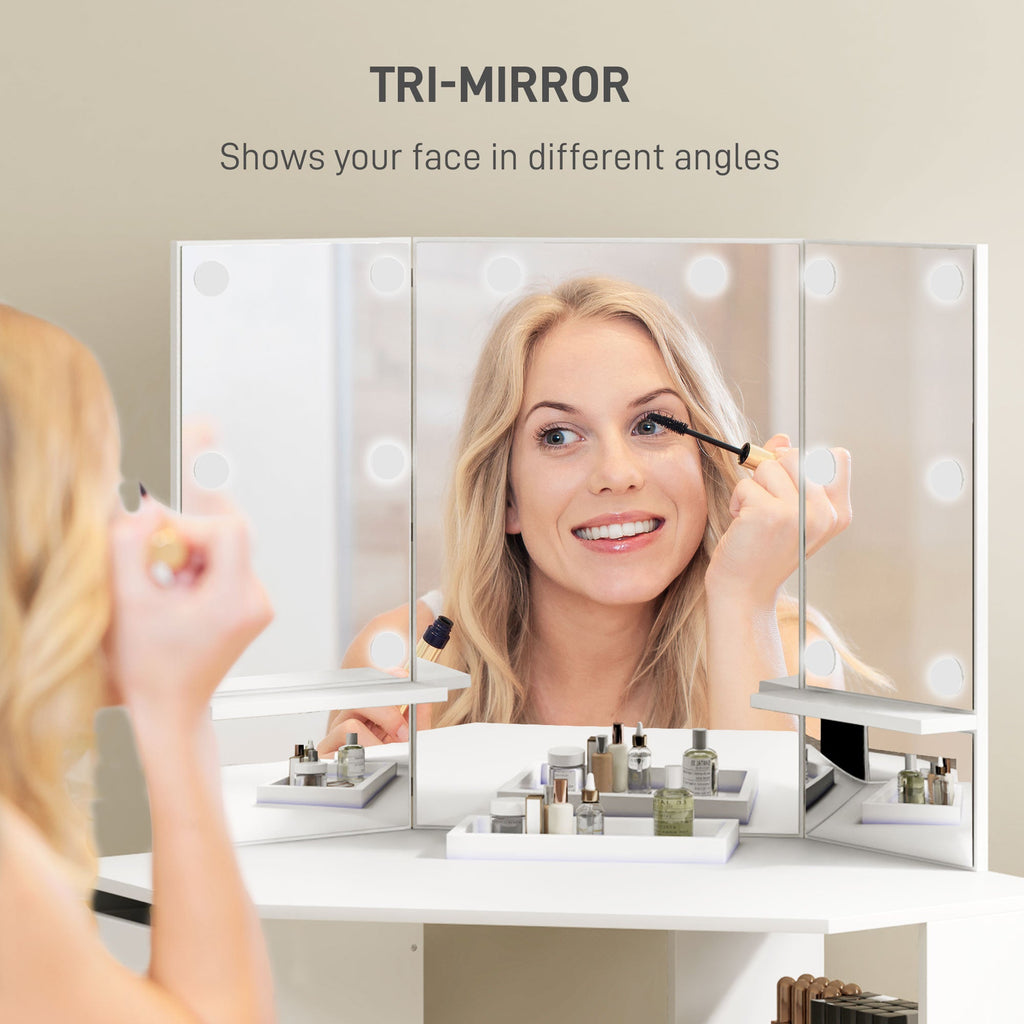 Elevate your beauty routine with this elegant vanity table featuring a large three-panel mirror and 10 removable USB-powered LED bulbs. The warm white light enhances your makeup application, offering a flattering glow for your daily beauty regimen. Designed with a spacious tabletop, two mirror shelves, five drawers, and a bottom open shelf, this vanity provides ample storage to keep your beauty essentials organized and within easy reach. Its compact, space-saving corner design fits seamlessly into any room layout, making it perfect for small apartments or bedrooms. Crafted from veneer particleboard, this vanity is built for stability, featuring an anti-tipping design and non-slip foot pads for added safety.