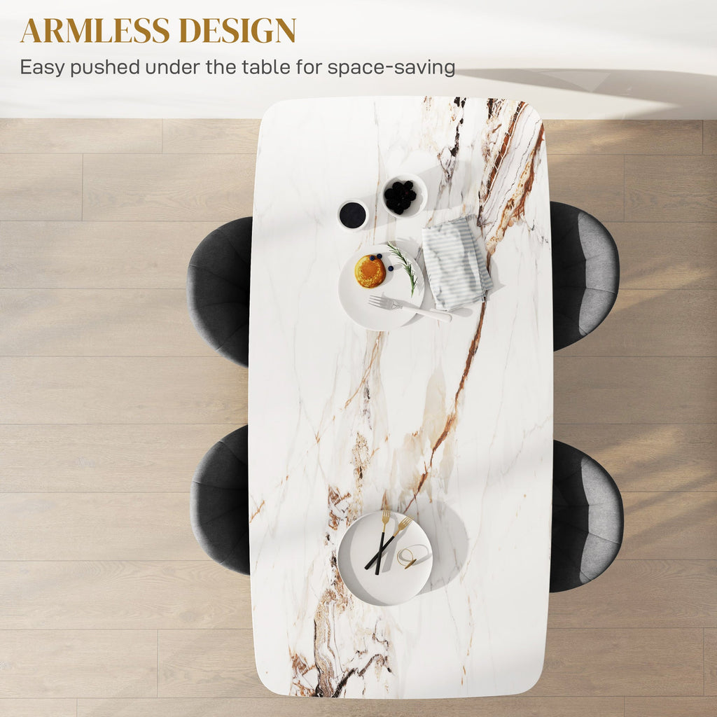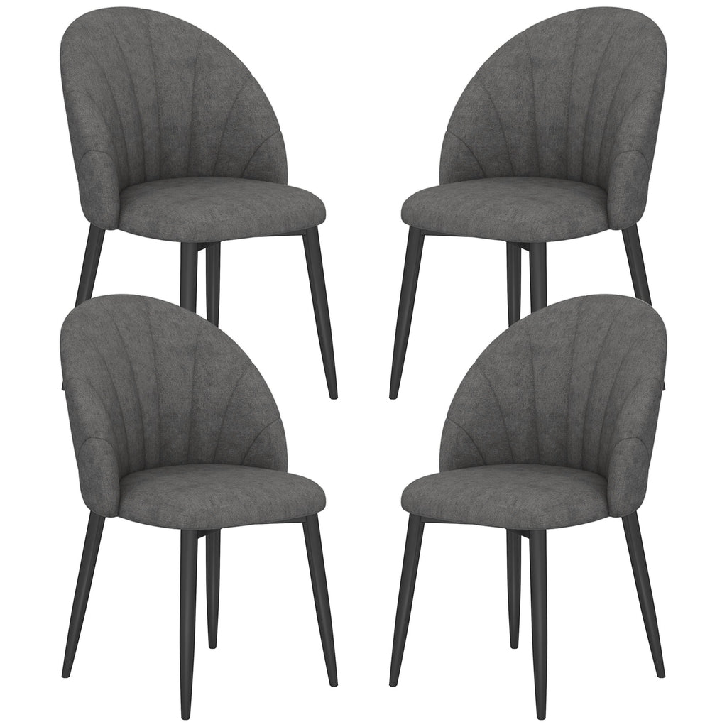 Upgrade your dining area with this Set of Four Modern Kitchen Chairs, a perfect blend of style, comfort, and functionality. Designed to seamlessly match any décor, these chairs feature an elegant shell-back design with exquisite stitching, adding charm without overwhelming your space. Whether you're enjoying daily meals, hosting dinner parties, or unwinding with an afternoon tea, these chairs provide both visual appeal and ergonomic support. Upholstered in soft, breathable fabric, they offer a cozy seating experience while being resistant to wrinkles and scratches for long-lasting durability. The curved backrest contours to your body, promoting good posture and comfort during extended sitting periods. Built with sturdy steel legs, each chair supports up to 265 lbs (120 kg), ensuring stability and reliability. The anti-slip foot pads not only enhance stability but also protect your floors from scratches, keeping them pristine. Versatile beyond the dining room, these chairs function beautifully as accent pieces in the living room or as stylish vanity chairs in the bedroom. Their armless, space-saving design allows them to slide easily under tables, making them ideal for compact spaces. Measuring 20.5" W x 21.3" D x 31.1" H (52 x 54 x 79 cm), these chairs come with all necessary accessories and clear instructions for effortless assembly.