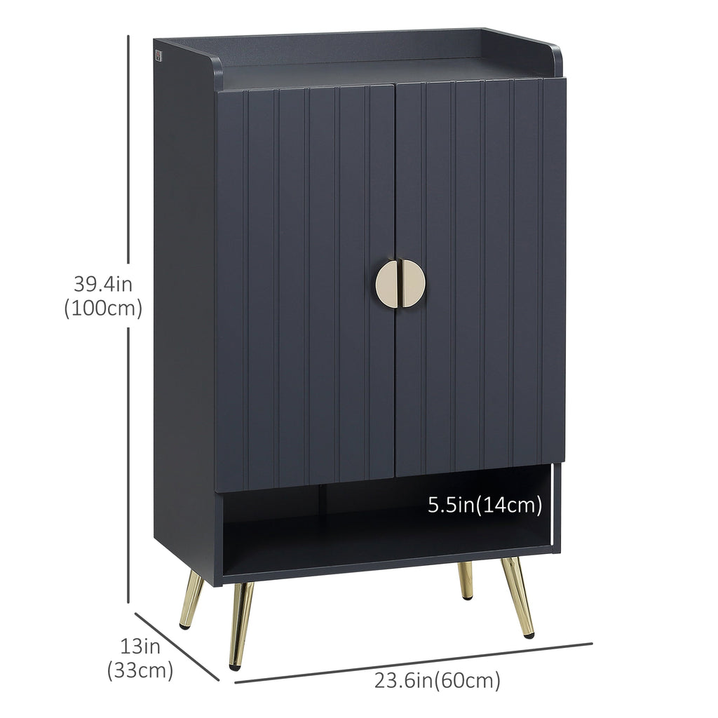 Bring elegance and functionality to your entryway with this stylish shoe cabinet featuring a beaded panel design, gold handles, and sturdy metal legs. Designed to blend seamlessly with modern and classic interiors, this shoe storage cabinet is both attractive and practical. It offers a combination of closed and open storage, including a 4-tier cabinet with three adjustable shelves to customize the space according to your needs. The open bottom shelf can accommodate up to 15 pairs of shoes (CA Men Size 10-10.5), while the spacious tabletop with protective sides provides a perfect spot for keys, decorations, or photo albums. Built with a durable particleboard structure and a reinforced steel frame, this shoe organizer ensures long-lasting stability and easy maintenance. For added safety, an anti-tip kit is included to securely mount it to the wall. The space-saving design, coupled with double doors for easy access, makes this shoe rack cabinet a perfect solution for small or narrow spaces. Measuring 23.6 inches in width, 13 inches in depth, and 39.4 inches in height, with each shelf supporting up to 22 lbs., this entryway organizer is a must-have for maintaining a neat and stylish home. Assembly is required.