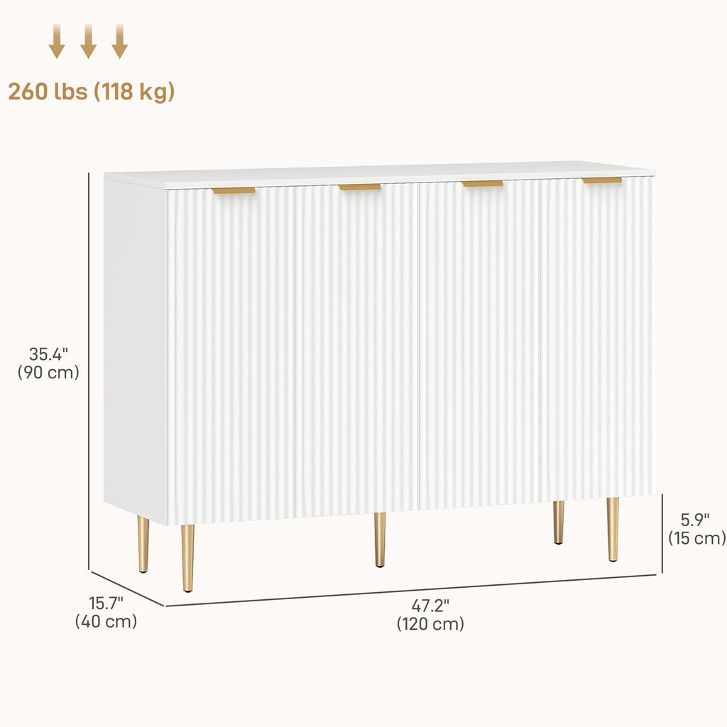 This buffet cabinet offers a spacious and practical storage solution, perfect for organizing your kitchen, dining room, or living area. With two double-door cabinets, it provides generous space for daily accessories, utensils, and other essentials, enhancing your overall storage capabilities. The cabinet features adjustable inner shelves that can be set to three different heights, offering flexibility for storing items of various sizes. Its elegant fluted design adds a modern touch to your home, making it a versatile piece that works perfectly as a stylish sideboard or a chic coffee cabinet. Crafted from durable painted MDF, this buffet is easy to maintain and built for lasting use. The elevated metal legs make cleaning a breeze, while the anti-tipping design ensures added safety. Adjustable foot pads further enhance the cabinet's stability, making it both a practical and attractive addition to your home. With overall dimensions of 47.2"W x 15.7"D x 35.4"H and a weight capacity of 260 lbs, this buffet cabinet offers both functionality and elegance for any living space.