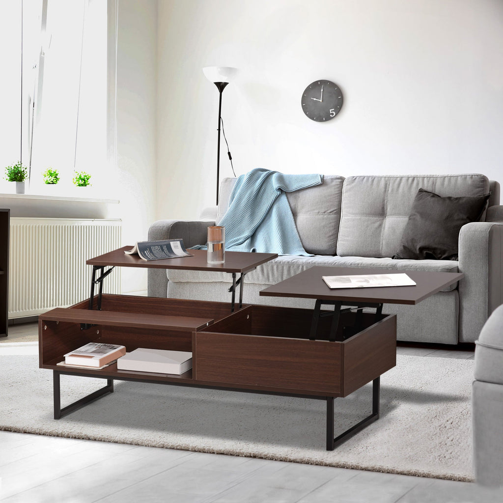 This versatile lift-top coffee table is a perfect blend of functionality and style, ideal for living rooms, home offices, or any space where you need a convenient work surface and storage solution. The innovative lift-top design allows the tabletop to be raised and pushed forward to create a floating work surface. The two desktops can be independently lifted and lowered without interfering with each other, offering flexibility for both work and relaxation. This coffee table features both open and closed storage compartments: the open shelf is great for storing magazines, newspapers, and books, while the hidden storage beneath the tabletop is perfect for keeping small items like keys, cards, pens, remote controls, and more neatly organized. Crafted from E1 grade wood and solid metal frames, this table offers solid construction that prevents wobbling or tipping when assembled correctly. The high-quality spring hinges system makes it easy to raise and lower the tabletop, while steel legs with non-slip footpads provide additional stability. With its clean industrial style, this coffee table effortlessly complements any decor and is perfect for spaces that require both practicality and aesthetic appeal. With overall dimensions of 47.2"L x 19.7"W x 15.7"-20.9"H and a weight capacity of 264 lbs (120 kg), this table is built for durability and convenience.