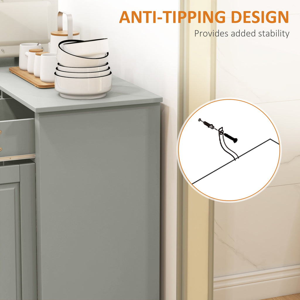 This multifunctional kitchen storage cabinet is a stylish and practical solution for organizing your home. Whether used as a buffet server in the dining area, a bar cabinet for your happy hour essentials, or an accent piece in the living room for your coffee bar, this versatile piece makes a low-key statement with its raised door panels and antique metal knobs. The top surface is perfect for serving dishes, while the drawers are ideal for utensils like spoons and forks, and the interior cabinets provide space for cooking utensils, keeping your essentials out of sight and dust-free. The adjustable shelf allows for customizable storage to fit your needs, making it even more flexible. Crafted from a solid MDF frame, this cabinet is durable and easy to maintain with its smooth surface that wipes clean effortlessly. The anti-tipping design ensures safety by allowing you to securely attach the buffet to the wall, protecting your family from accidental falls. Assembly is required for this elegant and practical storage solution.