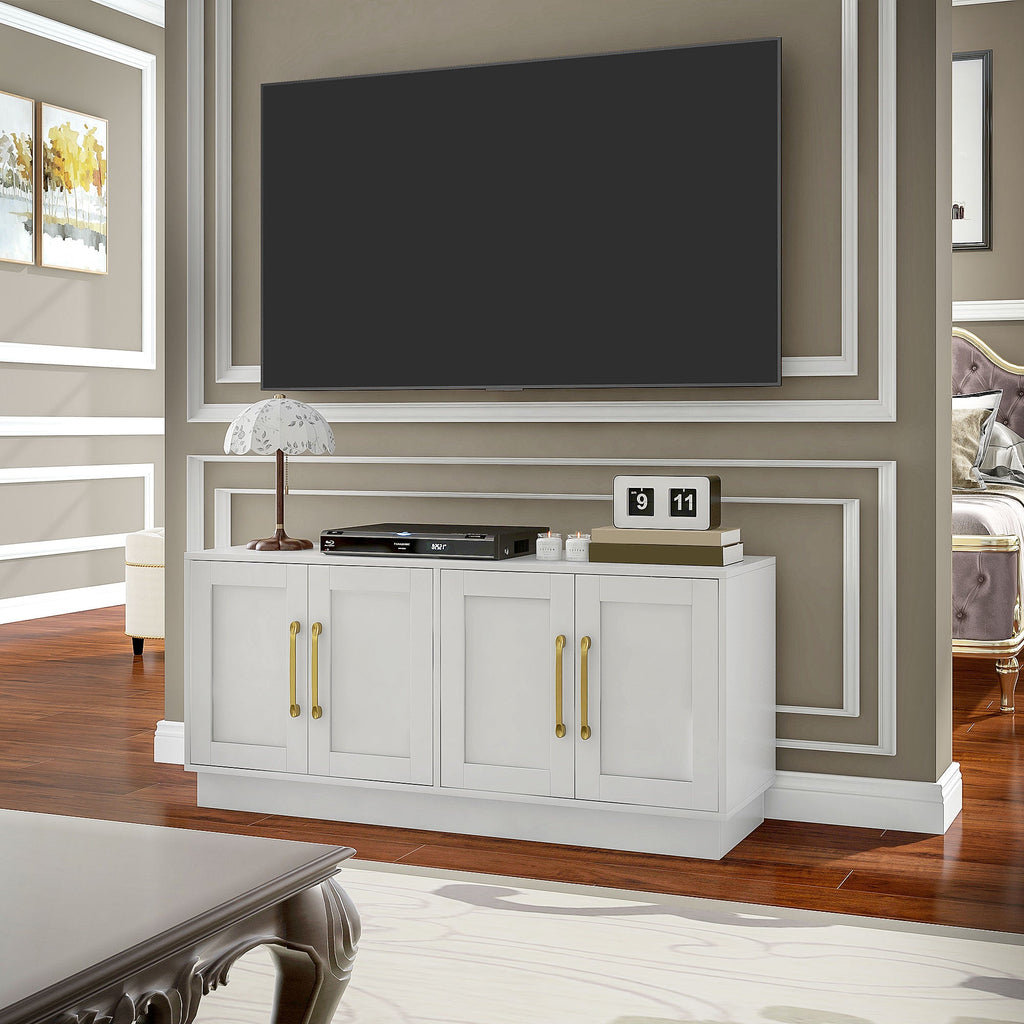 This elegant TV cabinet seamlessly combines modern design with practical functionality, making it a standout piece in your living room. Featuring a sleek white finish, recessed door panels, and stylish gold handles, this TV stand adds a touch of sophistication to any space. Designed to support large and heavy TVs, it accommodates models up to 55 inches, with a 47.2" (120 cm) long tabletop that holds up to 220 lbs (100 kg) overall. The versatile storage options include two enclosed cabinets with 3-level adjustable shelves, allowing you to easily organize media devices, video game consoles, and remote controls. Soft hinges ensure that the doors open and close smoothly, eliminating the annoying noise of traditional doors. Additionally, four cable holes provide convenient cable management, helping you keep your entertainment setup neat and clutter-free. With a detailed manual and clearly marked parts, this entertainment unit is easy to assemble, making it a hassle-free addition to your home.