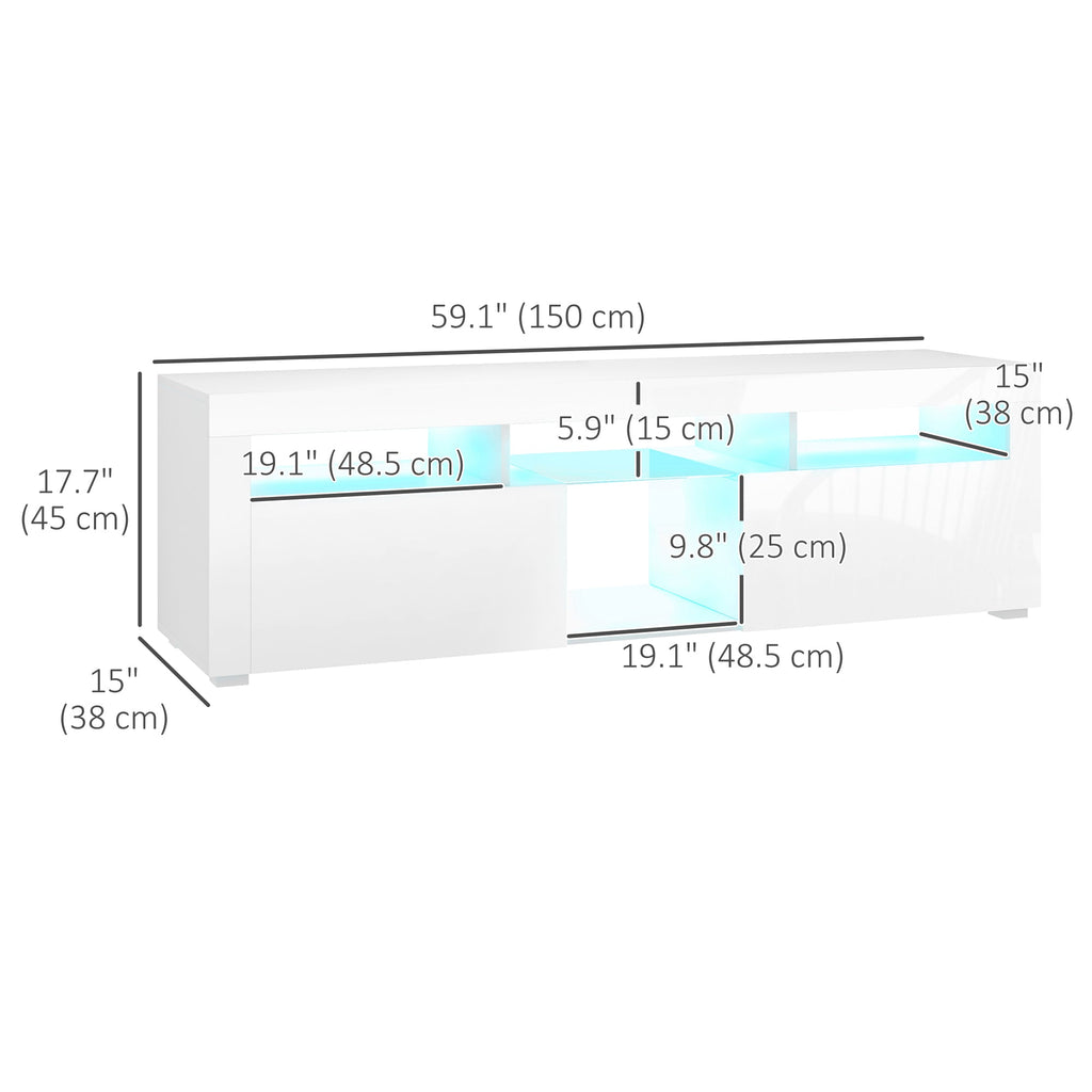 This modern TV cabinet offers both style and functionality, featuring dazzling LED lighting and ample storage space for all your media needs. The tempered glass shelf is equipped with a removable LED light strip, allowing you to customize the lighting with 16 colors, 16 brightness levels, and 4 dynamic modes: flash, strobe, fade, and smooth, all controllable via remote. With a spacious 59.1" (150 cm) top, this TV stand supports TVs up to 55 inches. It also includes two cabinets and four open compartments, providing plenty of room to store remotes, game controllers, media cases, decorations, and more. The high gloss finish on the front surface enhances the sleek, modern look, while the handle-free doors create a seamless aesthetic. Crafted from melamine-coated MDF and tempered glass, this TV unit is easy to clean and built for long-lasting use. The protective foot pads ensure your floors stay scratch-free, and assembly is straightforward with the included manual.