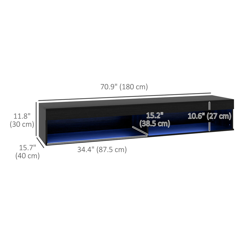 This floating TV shelf offers a sleek and modern design while saving floor space, making it an excellent choice for those seeking a minimalist and functional entertainment solution. The wall-mounted structure allows for flexible height adjustment, so you can position it at your preferred viewing level. Featuring dazzling LED lights, this TV shelf allows you to customize the ambiance with 16 colors, 16 brightness levels, and four changing modes (flash, strobe, fade, and smooth) controlled by a remote. The 70.9" (180 cm) top is suitable for TVs up to 75 inches, and the two open compartments with 3.1" (8 cm) top baffles offer secure storage space for media devices and accessories. Two back cable holes help conceal messy wires, keeping your setup clean and organized. Made from melamine-coated MDF and particleboard, the unit is strong and easy to maintain. This TV console supports up to 44 lbs (20 kg) and adds a stylish and practical touch to your living room.