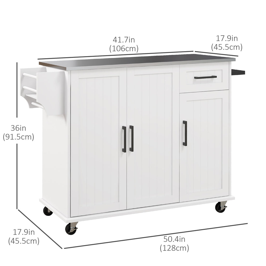 Elevate your kitchen with this versatile kitchen island cart, designed to offer both convenience and style. The spacious stainless steel countertop (41.7" W x 17.9" D) provides ample space for meal prep, whether you're baking cookies or making a homemade pizza with loved ones. The cart features a roomy drawer, side cabinet, towel rack, and double-door cabinet for hidden storage of kitchen essentials. Open side shelves keep bottles and food organized and easily accessible. Designed for effortless mobility, the cart is equipped with five smooth-rolling casters, including two lockable wheels to keep it securely in place when needed. Its sleek and simple design ensures that it blends seamlessly into your kitchen decor, making it the perfect addition for small kitchens or those looking to maximize space.