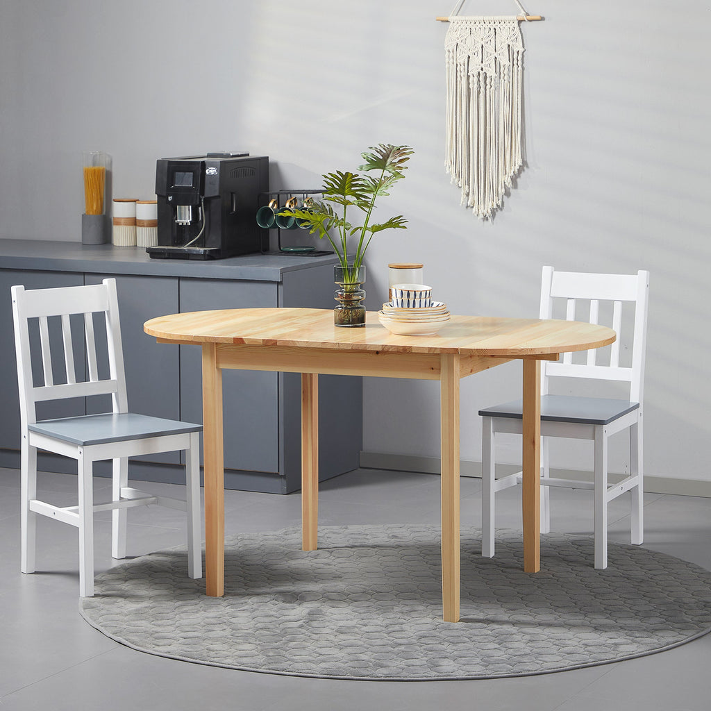 This versatile drop-leaf dining table is the perfect solution for maximizing your dining space, especially in homes with limited room. Designed with two hinged drop-down sides, it offers the flexibility to expand the tabletop to comfortably seat up to six people when fully extended. When not in use, simply drop down one or both sides to create more space in your kitchen or dining area. Its compact size makes it easy to store, allowing you to save precious space in your home. Crafted from solid natural pinewood, this table combines durability with natural beauty, bringing a warm, rustic charm to your dining room. The painted surface adds a stylish touch, and the table is strong enough to withstand daily use. The large tabletop provides ample space for meals, desserts, and entertaining guests, and it's easy to clean with just a damp cloth. Perfect for a variety of uses, this expandable table can also serve as a homework station, a drawing desk, or a gaming table for kids. Whether used for family dinners or multi-functional purposes, this folding dining table adjusts to your needs. The expanding dimensions are 55.1"L x 27.6"W x 29.5"H (140L x 70W x 75H cm), with a weight capacity of 110 lbs (50 kg) overall, and 11 lbs (5 kg) for each side leaf. Easy assembly is required.