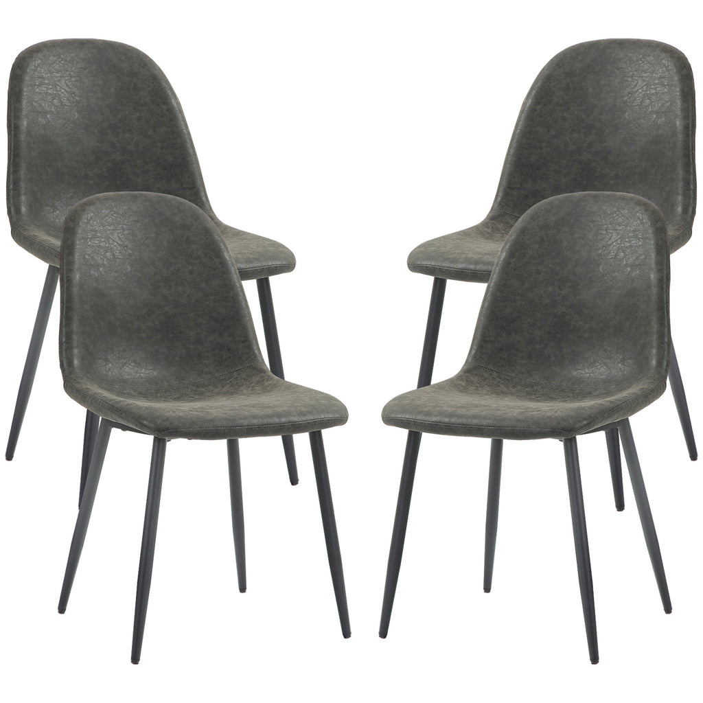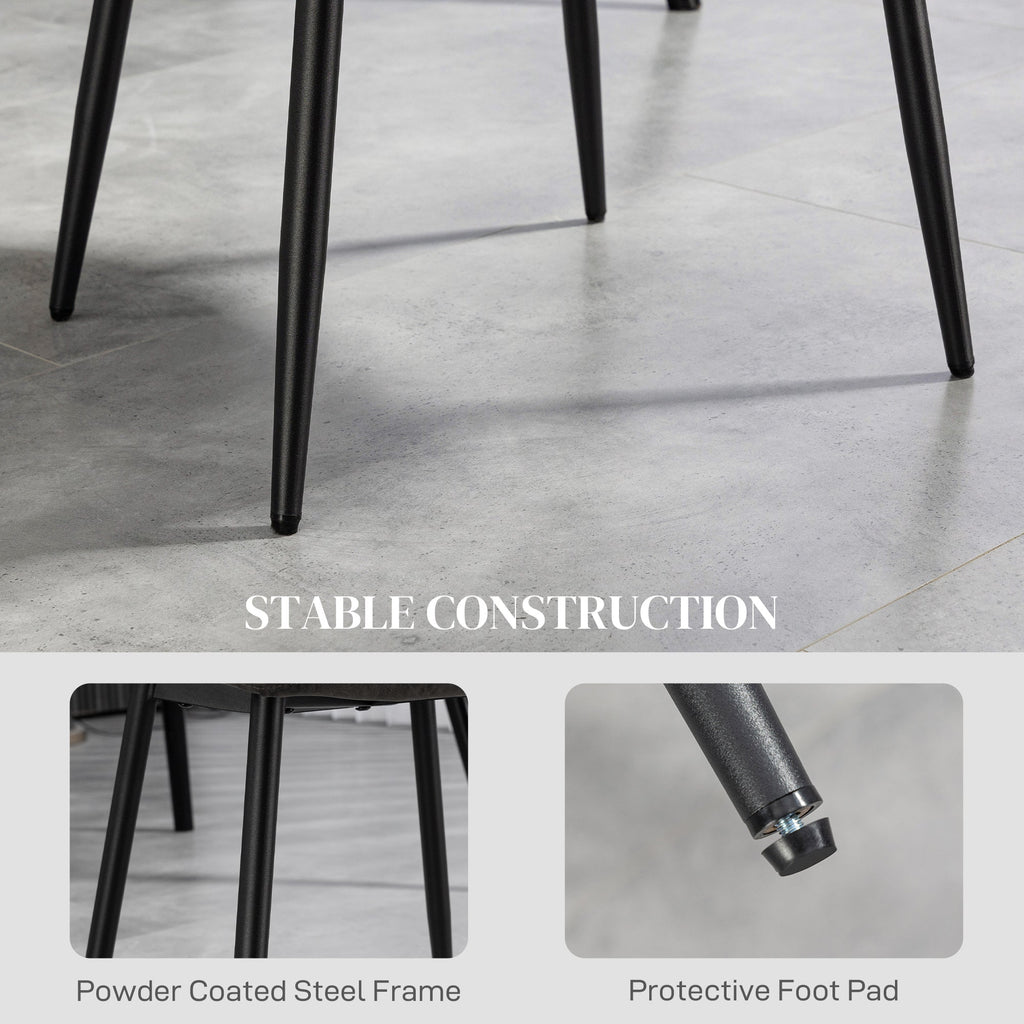 Transform your dining area with the HOMCOM Vintage Dining Chair Set, designed to blend retro charm with modern-day comfort. This set of 4 matching chairs features plush, padded PU leather seats that conform to your body’s natural curves, ensuring a comfortable dining experience. The contoured backrests provide excellent support, making each meal more enjoyable. With a vintage-inspired design, these chairs easily complement both modern and traditional decor styles. Their space-saving design allows them to tuck neatly under tables, perfect for smaller dining spaces. Built to last, these chairs are crafted with sturdy steel frames and a durable powder-coated finish. The water- and stain-resistant PU leather upholstery makes maintenance simple, requiring only a damp cloth to keep them looking new.