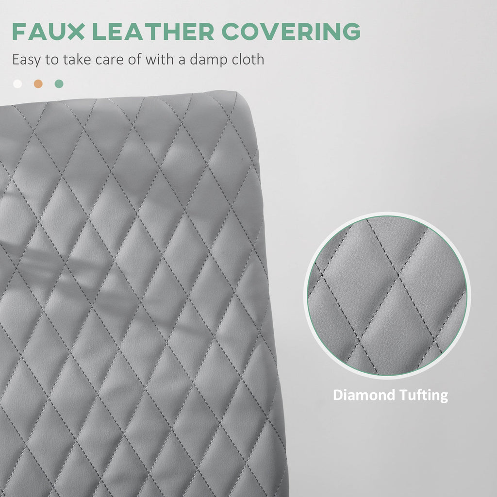 Add a touch of contemporary elegance to your home with this Modern Side Chair Set. Featuring a high back with classic diamond embroidery and shiny steel legs, these dining chairs are designed to seamlessly complement your modern décor. Their space-saving design allows them to be easily tucked under the table when not in use, making them perfect for smaller spaces. The PU leather surface ensures that these chairs are both easy to clean and durable, making them ideal for high-traffic areas and homes with pets. The padded seat cushions offer lasting comfort, providing you with a cozy and relaxing seating experience. Whether for your kitchen, dining room, bedroom, or living room, this set of 4 chairs will add a stylish and functional touch to any space.