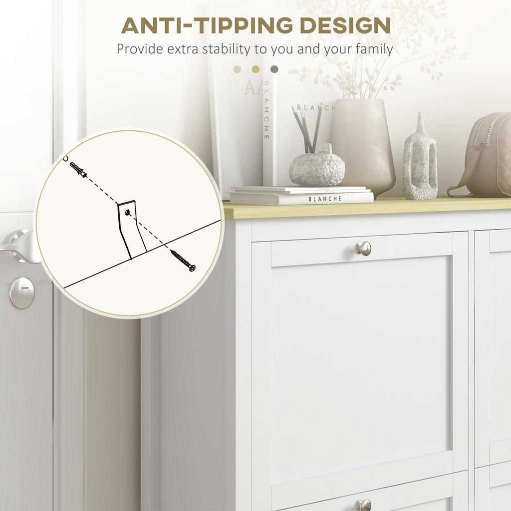 Maximize your entryway space with this practical and space-saving shoe storage cabinet, designed to fit narrow hallways and small spaces. Featuring four flip drawers with silver handles, this shoe organizer allows for easy opening and access to your shoes. Each drawer contains two-level adjustable shelves, providing storage for up to 20 pairs of shoes (up to CA Men Size 10). The flat tabletop adds convenience by offering a dedicated space for your keys, wallet, or other essentials. Made from durable melamine-faced particleboard, this cabinet ensures long-lasting use and is easy to maintain. The anti-tipping design on the back enhances stability, providing a secure and safe storage solution for families. With its minimalist modern design, featuring shaker panels and clean lines, this shoe cabinet blends seamlessly into any home décor.