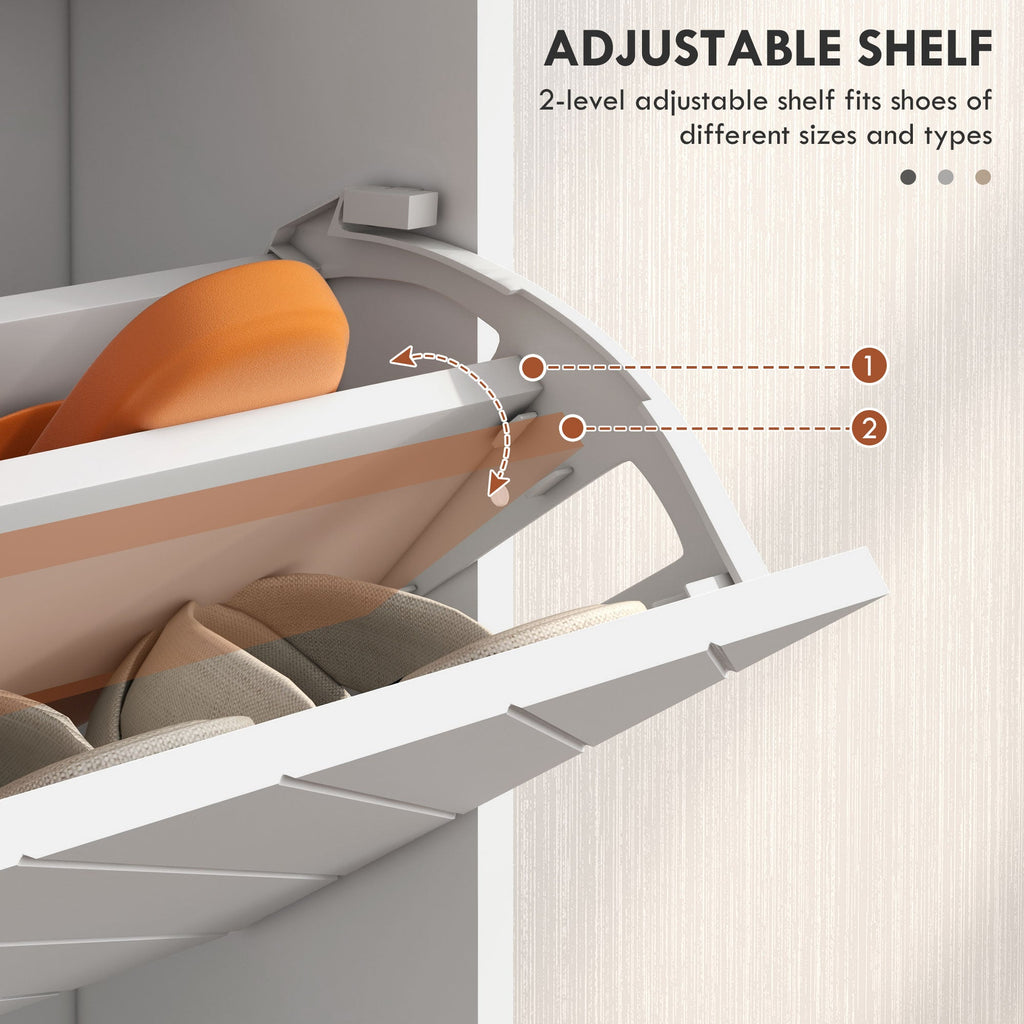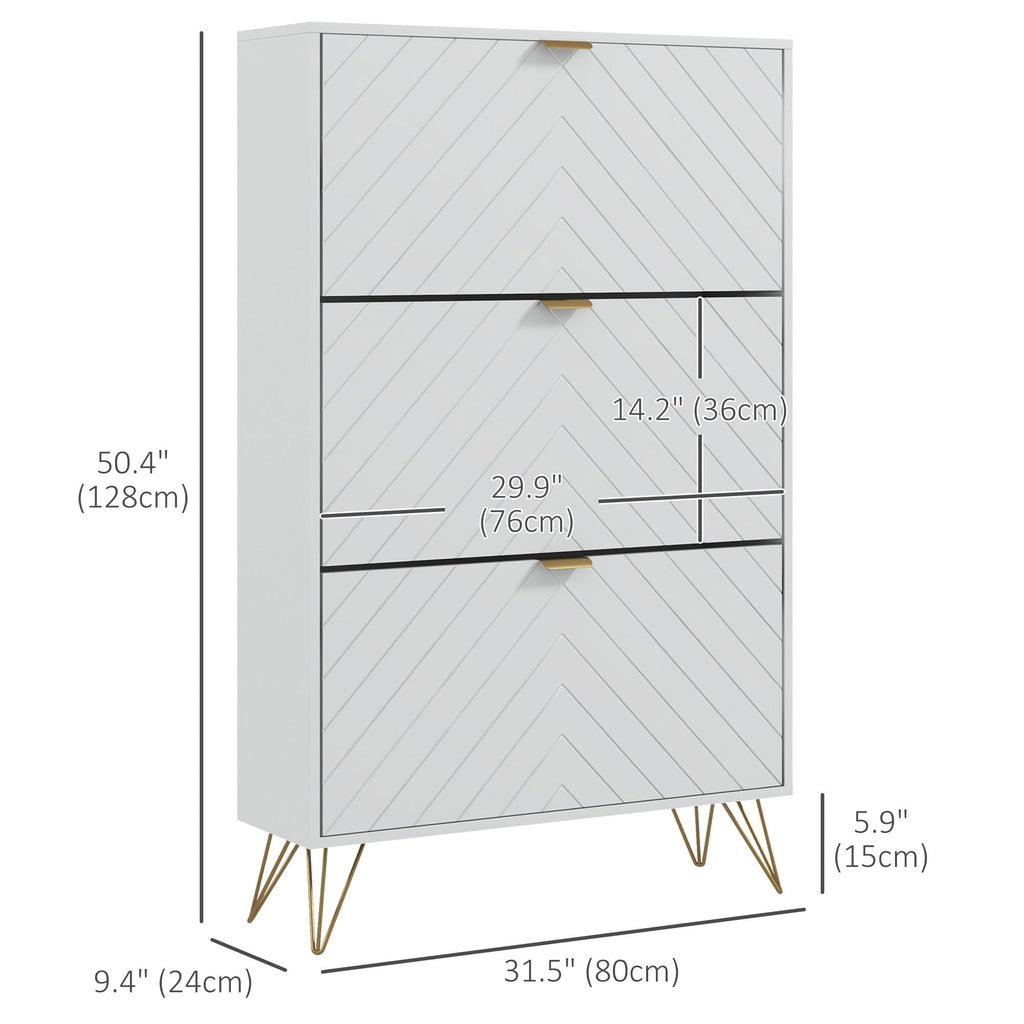 Say goodbye to shoe piles and hello to organized, stylish storage with this modern shoe cabinet. Featuring three flip drawers with adjustable and removable internal dividers, it provides versatile storage for up to 18 pairs of shoes, including ankle boots and high heels. The 8 ventilation holes on the back keep your shoes well-ventilated, preventing odor buildup and maintaining freshness. With its compact, narrow design, this shoe cabinet maximizes vertical space while minimizing its footprint, making it a perfect fit for smaller entryways or hallways. Made with a durable painted MDF frame and powder-coated steel legs, it offers both stability and easy maintenance. The anti-tipping design adds an extra layer of security, making it a safe choice for families. The stylish chevron-patterned doors, gold handles, and hairpin legs create a chic and modern look that fits seamlessly into various home decor styles.