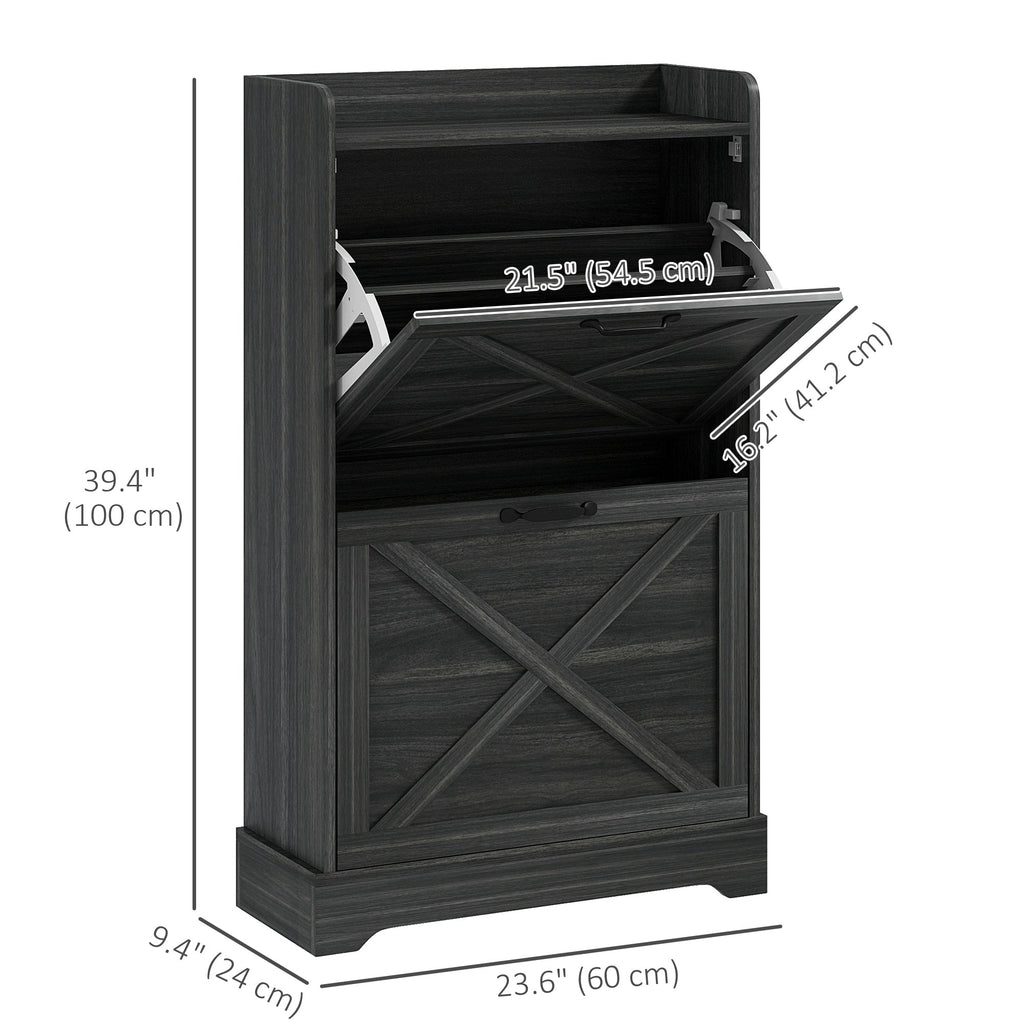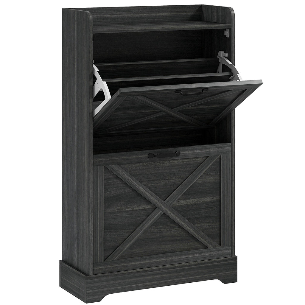 Bring a touch of rustic charm to your home with this farmhouse-style shoe cabinet. Featuring X-brace barn panels with distressed wood grain and sleek black handles, this entryway storage solution complements any hallway or bedroom with its unique, vintage-inspired design. Offering ample storage, the cabinet holds up to 8 pairs of shoes (max. size CA 12) and includes two flip drawers, each with a 2-level adjustable shelf to accommodate footwear of various heights like boots and high heels. The included ventilation holes keep your shoes fresh and odor-free, while the flat tabletop with edge protection is perfect for displaying knick-knacks or placing keys. Designed for smaller spaces, this slim and compact shoe rack features an anti-tipping design for added safety and durability, making it a practical choice for any entryway.