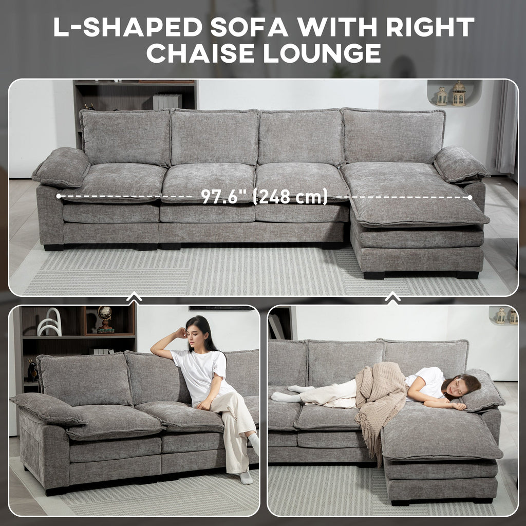 This spacious 5-seater L-shaped sofa is the perfect blend of style and comfort, ideal for modern living rooms. Featuring a large integrated chaise lounge, this sofa provides ample space for relaxing, with extra room to stretch out and unwind. Upholstered in soft chenille fabric, it brings a luxurious touch to any room while offering plush support with its four back cushions and double-layer seat cushion. The 11.8" (30 cm) thick seat and 9.8" (25 cm) thick backrest ensure excellent comfort and full body support. Additionally, the pocket spring seat construction, combined with high-density foam, reinforces the cushions for long-lasting shape and comfort, making this sofa both stylish and functional.