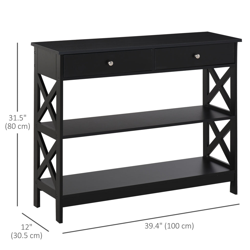 Dimensions: 39.4" W x 12" D x 31.5" H (100 x 30.5 x 80 cm), Drawer size: 16.1" W x 9.4" D x 2.6" H (41 x 24 x 6.5 cm), Shelf size (single): 37" W x 11.2" D x 9.8" H (94 x 28.5 x 25 cm).