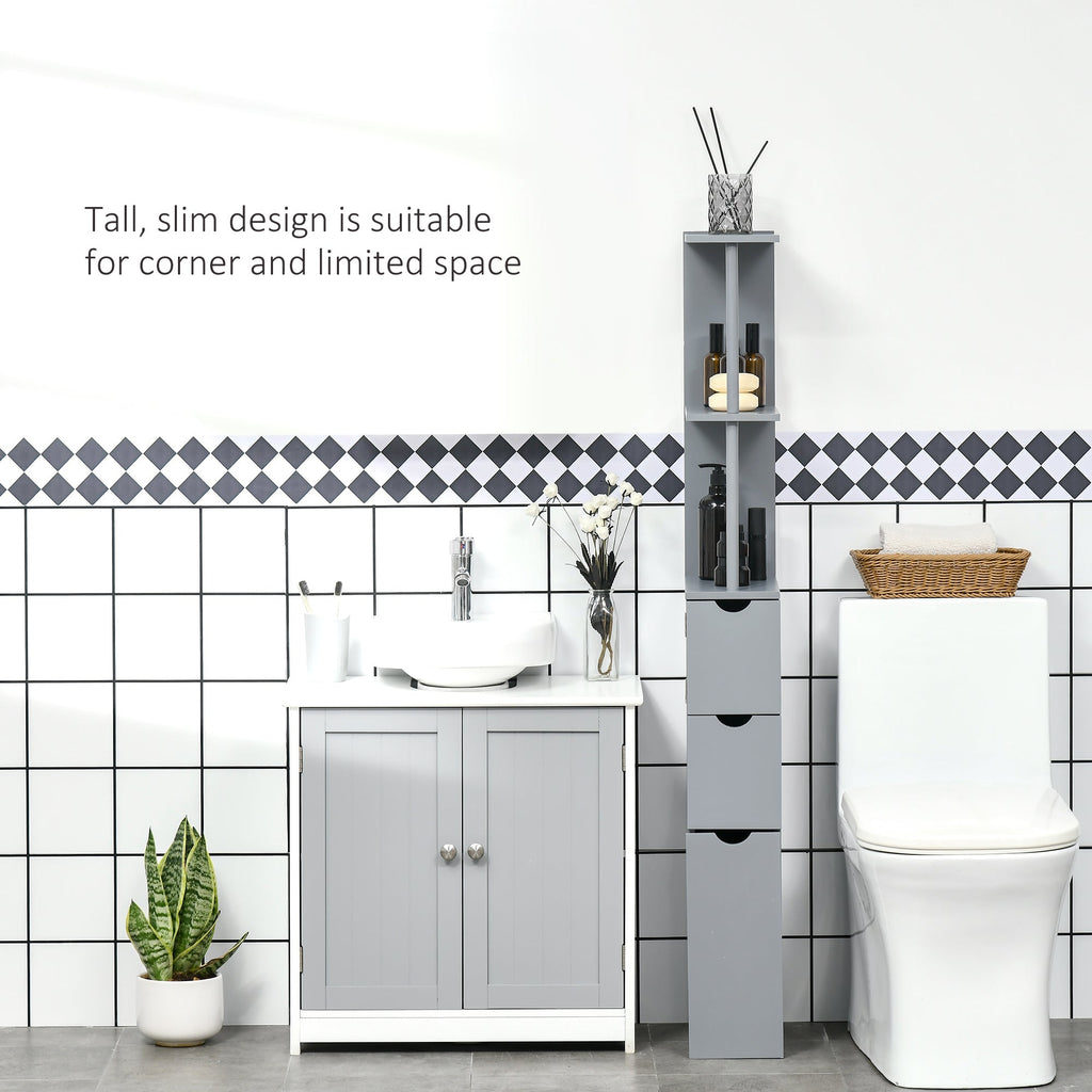 Maximize your storage space with this compact and stylish narrow bathroom storage cabinet. Designed to fit perfectly in small and narrow spaces, this cabinet measures just 5.9 inches in width, making it an ideal solution for bathrooms, kitchens, hallways, or any area with limited space. Featuring two open shelves, a closed cabinet with a door, and two drawers, this storage unit provides ample space for organizing toiletries, towels, cleaning supplies, or other essentials. Crafted from solid MDF, it offers a sturdy and reliable structure with a modern, minimalist design that complements any home decor. Assembly is quick and easy with the included manual and necessary hardware. Whether placed in the bathroom, kitchen, or hallway, this slim storage cabinet provides both function and style.