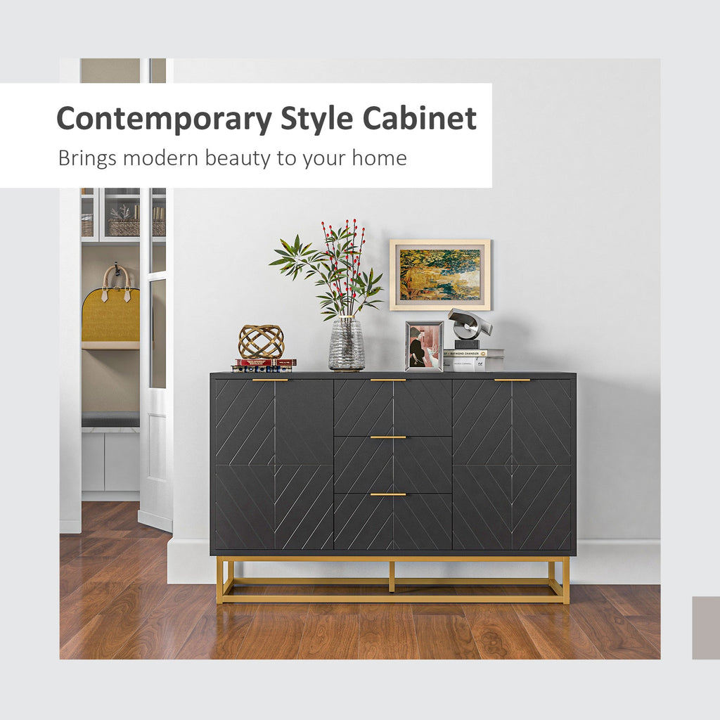 Enhance your home with this elegant sideboard, featuring a sophisticated design with geometric doors and golden accents that add a touch of luxury to any space. Whether placed in the living room, kitchen, dining area, or entryway, this modern credenza serves as a stylish and functional storage solution. The spacious two-door cabinet offers ample room to organize daily essentials, while three smooth-gliding drawers provide convenient storage for smaller accessories. The large top surface is perfect for use as a coffee bar or for displaying decorative items. Designed for versatility, this cabinet includes two adjustable interior shelves, allowing for customizable storage to suit your needs. Crafted from high-quality MDF and reinforced with metal, this kitchen cabinet ensures durability and easy maintenance. An anti-tipping kit and extra support leg add stability, making it a safe choice for your home.