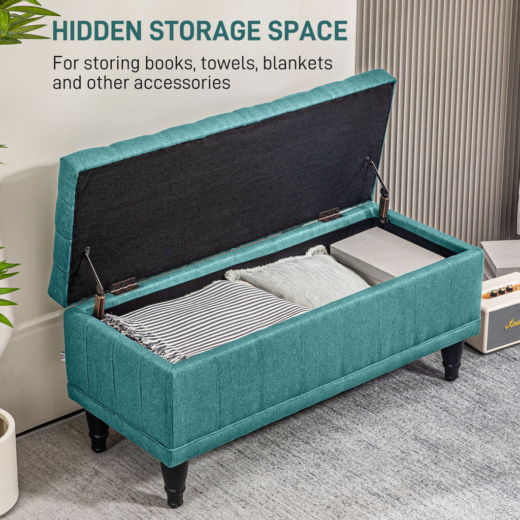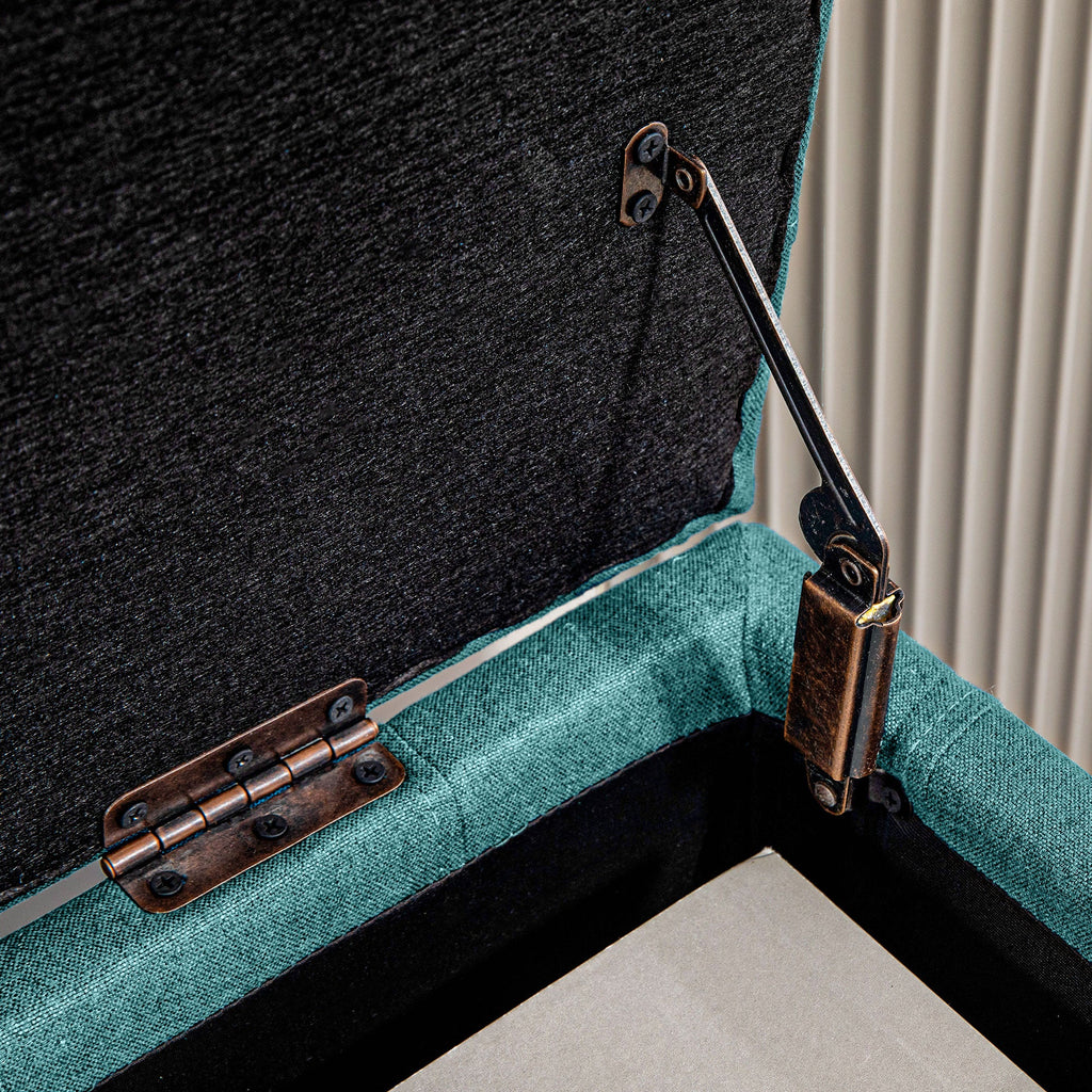 Enhance your home with this chic designer-style storage bench, perfect for adding elegance, functionality, and comfort to your living room, bedroom, or entryway. Upholstered in a premium linen-feel fabric, this bench complements modern and contemporary décor while offering a versatile seating and storage solution. The thickly padded foam cushion top ensures superior comfort, making it an excellent choice for additional seating. Built with a sturdy solid upper frame and supported by four dark hardwood feet, this bench provides reliable stability with a weight capacity of up to 265 lbs. The soft-closing lid opens to reveal a spacious storage compartment, ideal for organizing blankets, pillows, shoes, and more. With its sophisticated design and practical features, this storage ottoman is both a stylish and functional addition to any space.
