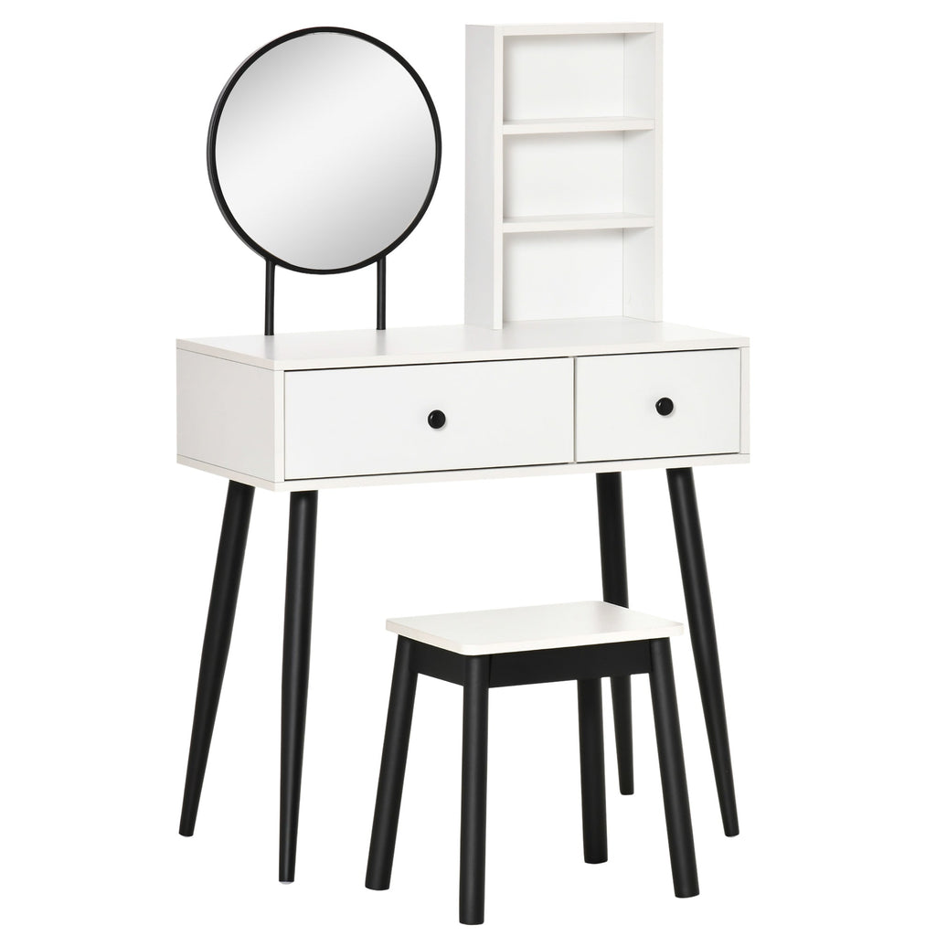 Add a touch of modern elegance to your bedroom or dressing area with this chic vanity makeup table set. Designed with a rounded glass mirror, sleek black frame, and splayed solid wood legs, this vanity set enhances your space while serving as an essential part of your daily beauty routine. The spacious tabletop, three-tier shelves, and two pull-out drawers provide ample storage for makeup tools, skincare products, and accessories. The clear, 90°-angled round mirror offers a comfortable viewing position for effortless makeup application. Crafted from durable particle board with sturdy rubber wood legs, this dressing table ensures stability and long-lasting use. Protective footpads prevent floor scratches, making this an ideal addition to any home.