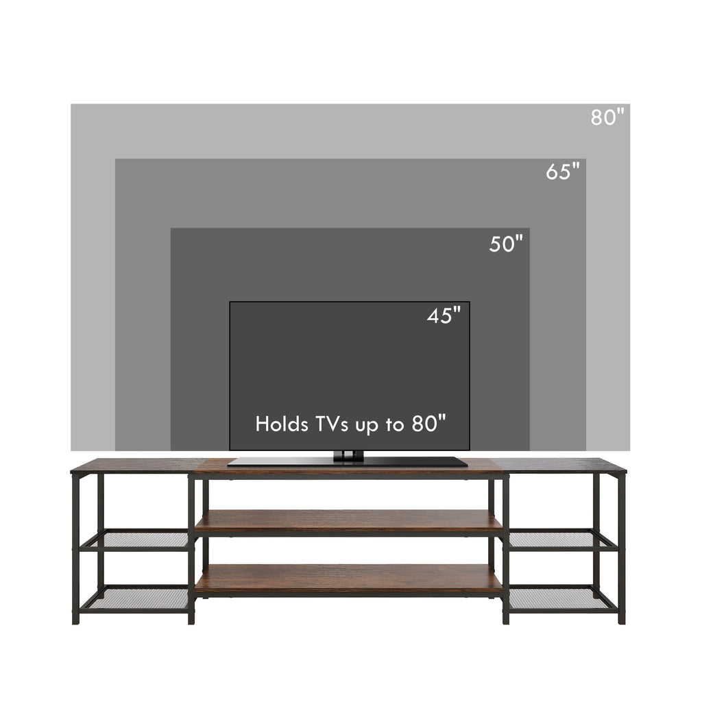 This industrial-style TV table blends functionality with aesthetics, making it the perfect addition to your living space. Featuring a large, mosaic-designed tabletop and six open shelves in varying sizes, it provides ample storage for your books, movies, video games, and other media essentials. The fully open design allows for easy connectivity of wires without the hassle of tangling, keeping your space organized and clutter-free. Built with a strong steel frame, this entertainment unit is stable and able to support TVs up to 80 inches. The bottom shelf is raised 2 inches from the floor, making cleaning underneath the console a breeze. Footpads on the legs prevent floor scratches while ensuring stability.
