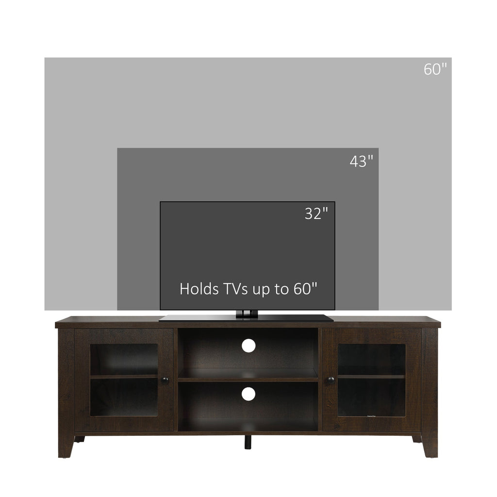 This modern and classic TV unit combines clean lines with elegant design, making it a standout addition to any living room. The unit accommodates TVs up to 60 inches and offers ample storage with two open shelves and two cabinets with adjustable shelves. Perfect for storing your media devices, DVDs, or other essentials, the TV stand ensures easy organization with two 2" cable holes for tidy wire management. Made from high-quality MDF board and tempered glass, this unit is built to last while offering strong stability with five sturdy legs. It's both practical and stylish, bringing functionality and sophistication to your space.