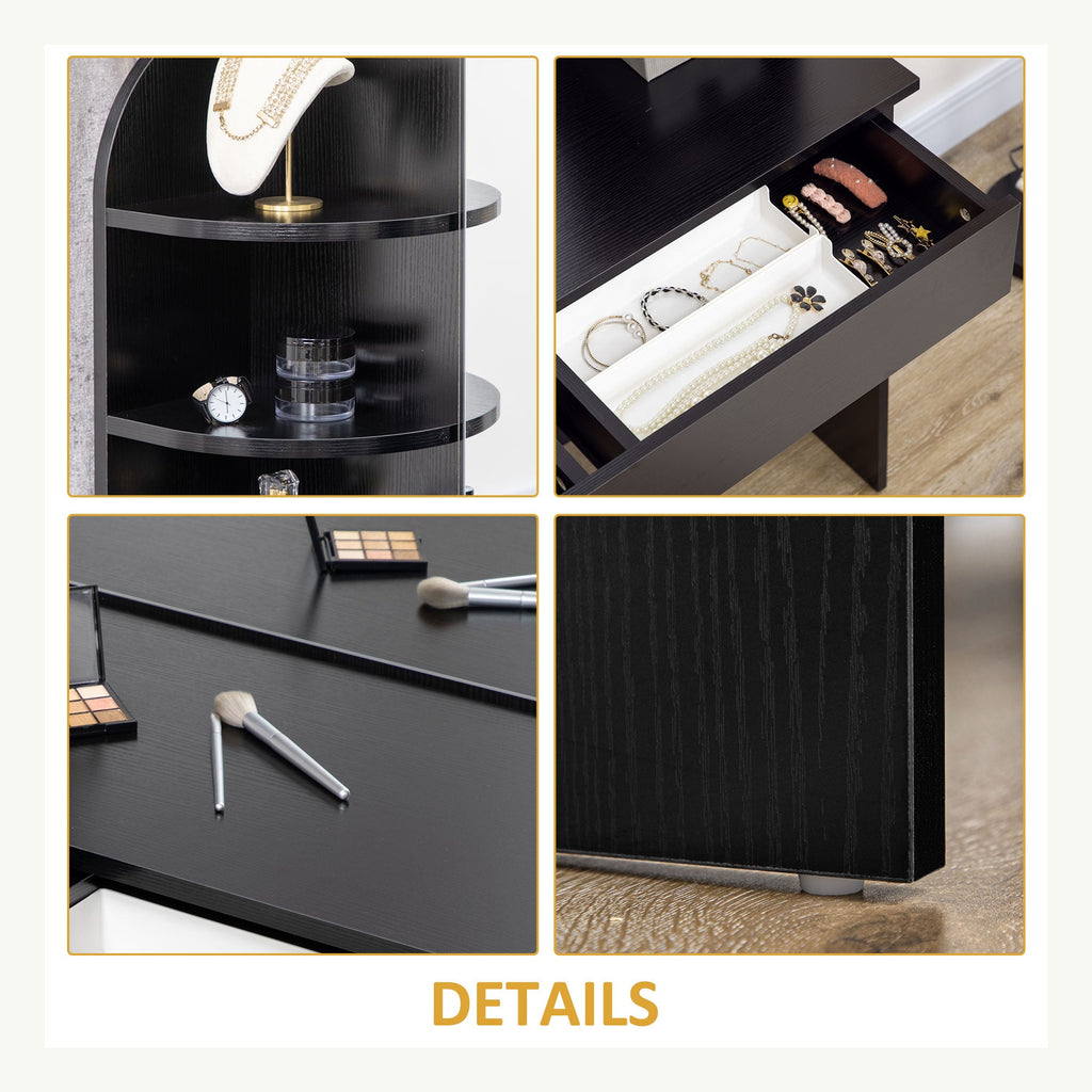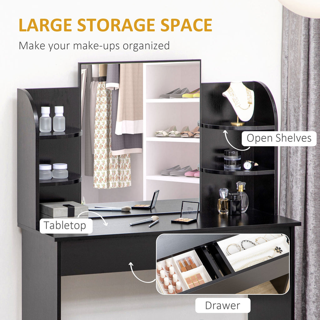 Enhance your bedroom with this elegantly designed vanity table, the perfect place to get ready every day. Featuring a spacious tabletop, this versatile piece doubles as a desk for added functionality. Designed with convenience in mind, the vanity includes three-tier shelves on each side of the mirror, providing ample space for makeup, perfumes, and personal accessories, while a pull-out drawer beneath the table offers additional storage. The polished surface not only adds a sleek, sophisticated look but also ensures easy cleaning for long-lasting beauty. Crafted from high-quality particleboard with a durable mirror, this makeup desk is built for everyday use. With overall dimensions of 42.5"L x 15.75"W x 56"H, and a tabletop size of 42.5"L x 12.75"W, this vanity set offers a perfect balance of style and practicality. The sturdy structure supports up to 176 lbs overall, with the tabletop accommodating up to 132 lbs. Assembly is required.