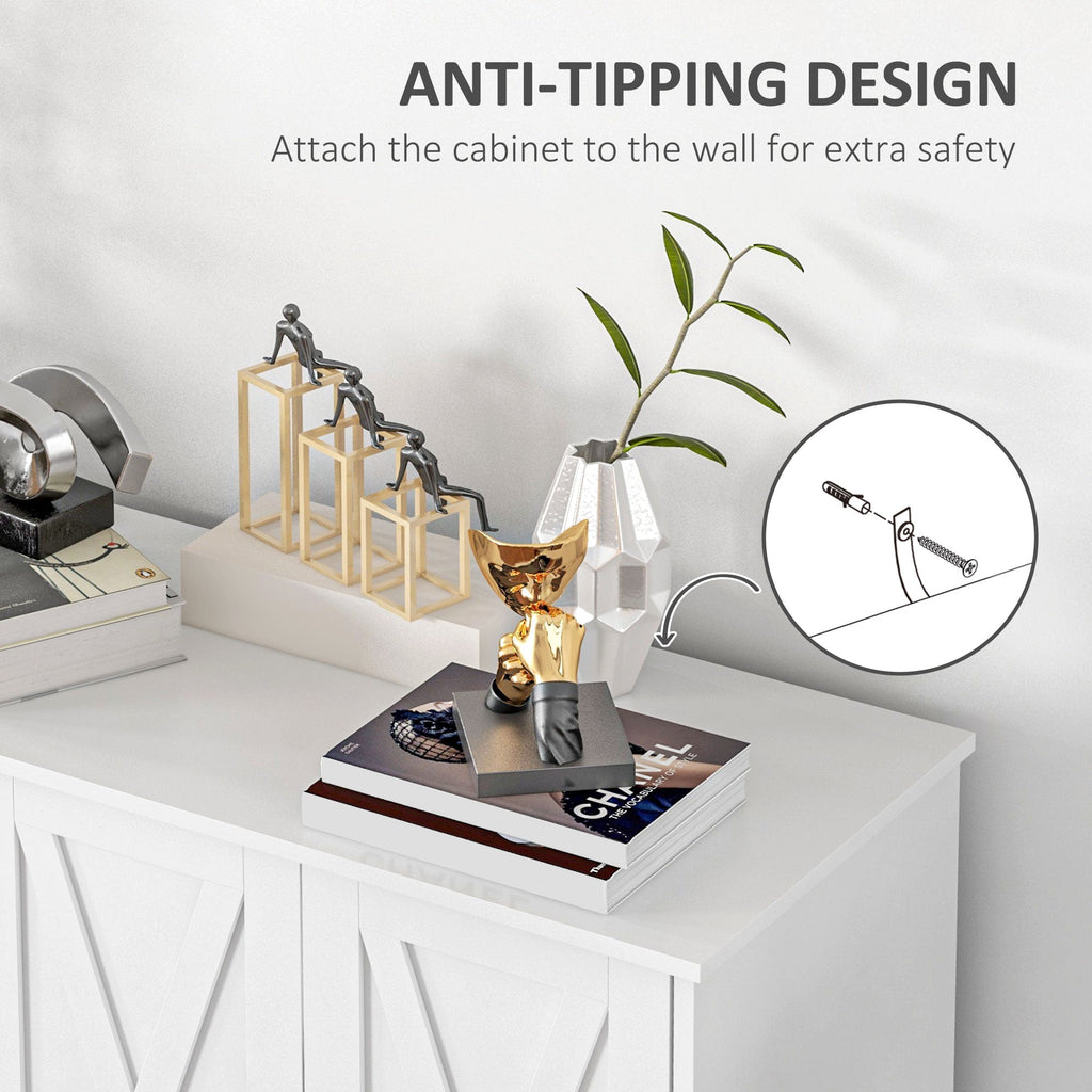 Add rustic charm and functional storage to your home with this versatile farmhouse-style kitchen cabinet. Designed with two spacious double-door cupboards, this sideboard offers ample storage for dishes, glasses, and kitchen essentials, while the adjustable three-level shelves provide customizable organization. Not just for the kitchen, this cabinet doubles as a stylish TV stand, accommodating TVs up to 55 inches, or as a buffet server in the dining area. The X-brace barn doors and black accent hardware bring a warm farmhouse aesthetic, making it a standout addition to any space. Crafted from durable painted MDF, this credenza ensures stability with its center leg support, adjustable foot pad, and anti-tipping design for safety. Whether used as a coffee bar, TV console, or kitchen sideboard, this multifunctional piece blends storage, style, and convenience seamlessly.