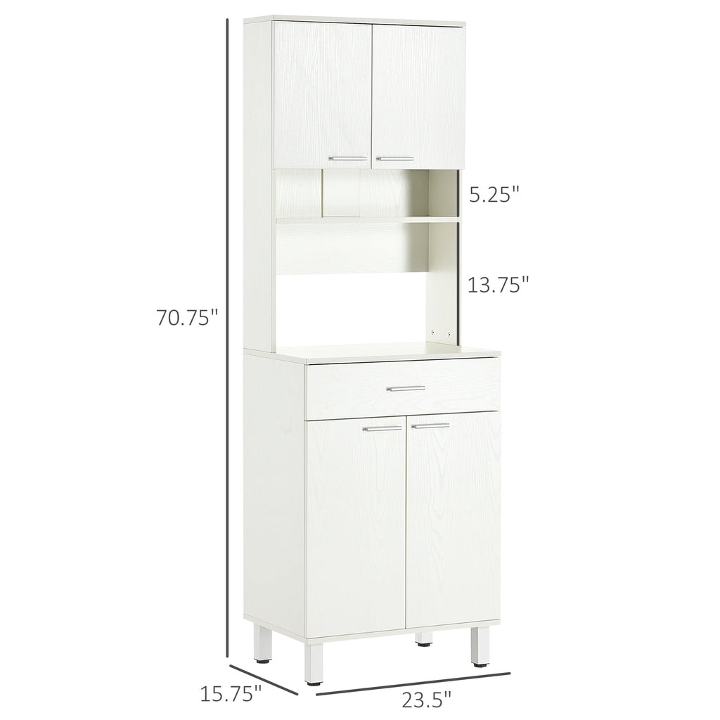 Bring modern style and functionality to your home with this sleek and versatile kitchen cabinet. Coated with a wood grain veneer, this slim pantry cabinet seamlessly blends into contemporary home décor while maximizing storage space. Designed for various uses, it works perfectly as a kitchen hutch, a dining room sideboard, or even a bookshelf in the living room or study. Offering ample storage, this unit features upper and lower cabinets, each equipped with an extra shelf, making it ideal for storing jars, cans, and dry goods. The open shelf provides easy access to frequently used spices and condiments, while the spacious countertop is perfect for holding a microwave, coffee machine, or small kitchen appliances. Additionally, a wide drawer is included to store utensils and other essentials, ensuring everything stays organized. Built for durability, this storage cabinet is constructed from engineered wood with a wood grain veneer, making it both sturdy and easy to clean. The elevated base, supported by durable metal feet, prevents moisture damage, adding longevity to the piece. For enhanced safety, the freestanding cabinet includes an anti-toppling device, allowing you to secure it to the wall to prevent accidental tipping. With overall dimensions of 23.5 inches in length, 15.75 inches in width, and 70.75 inches in height, this microwave cabinet is designed to fit in small spaces while offering maximum storage. The cabinet supports up to 33 lbs, while the open storage area holds up to 22 lbs. Assembly is required.