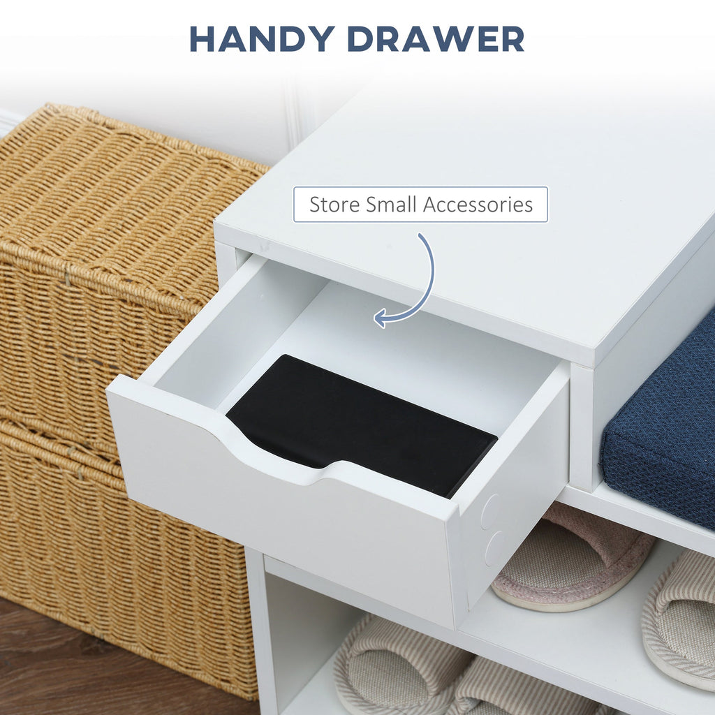 Add a touch of modern elegance to your home with this stylish and functional shoe storage bench. Designed with sleek panels and a natural color finish, this shoe rack blends seamlessly with a variety of home décor styles. Perfect for use in entryways, bedrooms, cloakrooms, or living rooms, it provides both seating and organized storage. The bench features a spacious pull-out drawer, ideal for storing small sundries, while the open shelves offer ample space to neatly arrange your shoes. Designed for comfort, this shoe bench includes a thick padded cushion wrapped in breathable linen fabric, providing a cozy seat while putting on or taking off shoes. The cushion cover is equipped with a zipper, making it easy to remove and wash for added convenience. Built with a sturdy engineered wood frame, this storage bench ensures durability and long-lasting reliability. Whether used as an entryway organizer or a functional accent piece, this modern shoe rack bench is a practical addition to any home. Assembly is required.