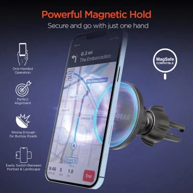 The HyperGear® Mag Grip Phone Mount Kit offers a versatile and secure mounting solution for your phone, featuring MagSafe® technology. This kit includes three mounting options—vent, dash, and windshield mounts—allowing you to easily attach your phone in your car, wherever is most convenient. With strong magnets and a sleek black design, the Mag Grip ensures that your phone stays securely in place, even on bumpy rides. The universal compatibility with MagSafe® makes it perfect for iPhones and other devices with magnetic charging compatibility.