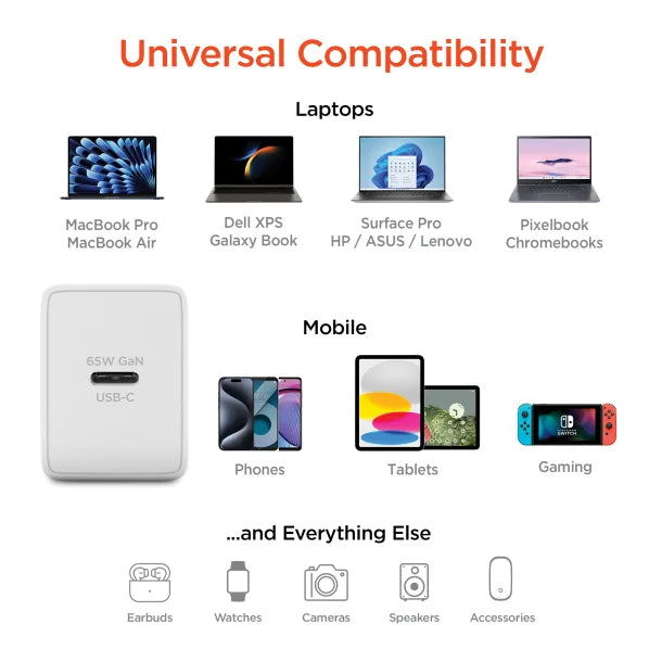 - 65-Watt Power Delivery: Delivers rapid charging for USB-C® laptops, tablets, and smartphones, ensuring quick power-ups when you need them most.