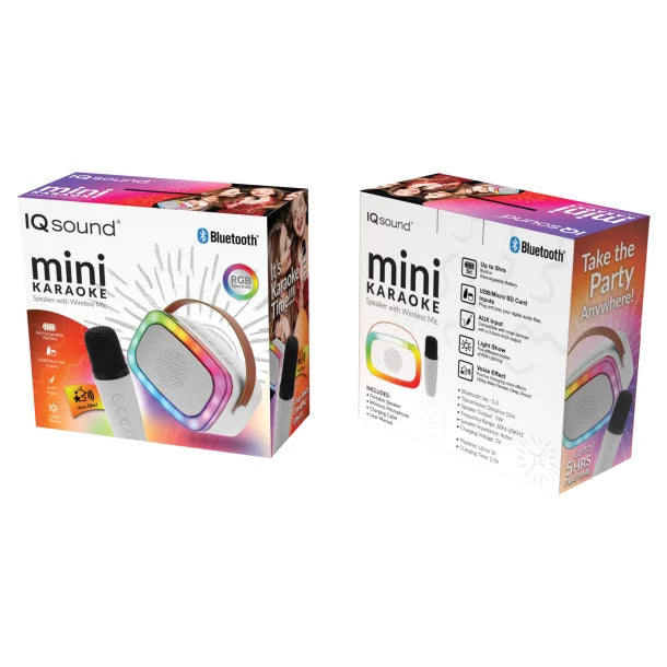 Turn any moment into a celebration with the IQ Sound® Mini Karaoke Portable Bluetooth® Speaker IQ-908K in sleek white. Perfect for karaoke lovers, this compact speaker comes with a wireless microphone, Bluetooth® connectivity for easy music streaming, and a mesmerizing RGB light show that syncs with the beat of the music. Its portability makes it ideal for impromptu karaoke sessions, while its powerful sound and dynamic lights enhance any gathering. Whether for sing-alongs, music, or simply enjoying some light effects, this vibrant speaker brings energy and fun wherever you are.