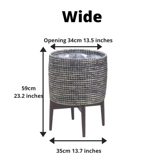 Elevate your home décor with the Jax Black Tall Mid-Century Planter With Turned Leg Stand. Handwoven from sustainably grown water hyacinth, each planter is a one-of-a-kind work of art. Its modern-minimalist design and sturdy turned leg stand make it perfect for indoor spaces. Pair it with any artificial plant for a stylish, maintenance-free display. Available in small, medium, and large sizes.
