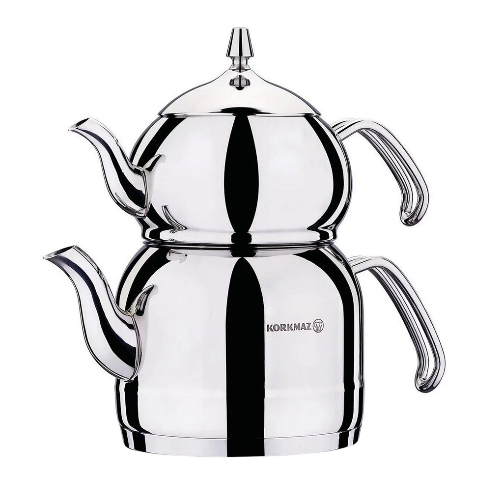 Experience the art of tea-making with the Korkmaz Efendi Tea Pot and Kettle Set. This exquisite set features a 1.1-liter tea pot and a 2.4-liter kettle, both crafted from high-quality stainless steel for durability and superior heat retention. The polished silver finish adds a touch of elegance to your kitchen, making tea time a sophisticated affair. The ergonomic handles ensure a comfortable and secure grip, making pouring effortless. Whether you're brewing for a small gathering or a large family, this set is perfect for all occasions.