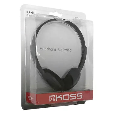 The KOSS® KPH8 On-Ear Headphones in black are designed for those who want high-quality sound in a lightweight, portable design. These headphones feature a comfortable on-ear fit with soft ear cushions, providing excellent sound isolation without sacrificing comfort. With a durable, flexible headband and adjustable features, the KPH8 offers a personalized and secure fit for extended listening sessions. Whether you're enjoying music, podcasts, or calls, these headphones deliver clear, rich sound with deep bass and crisp highs. The stylish black finish adds a sleek touch to your audio experience.