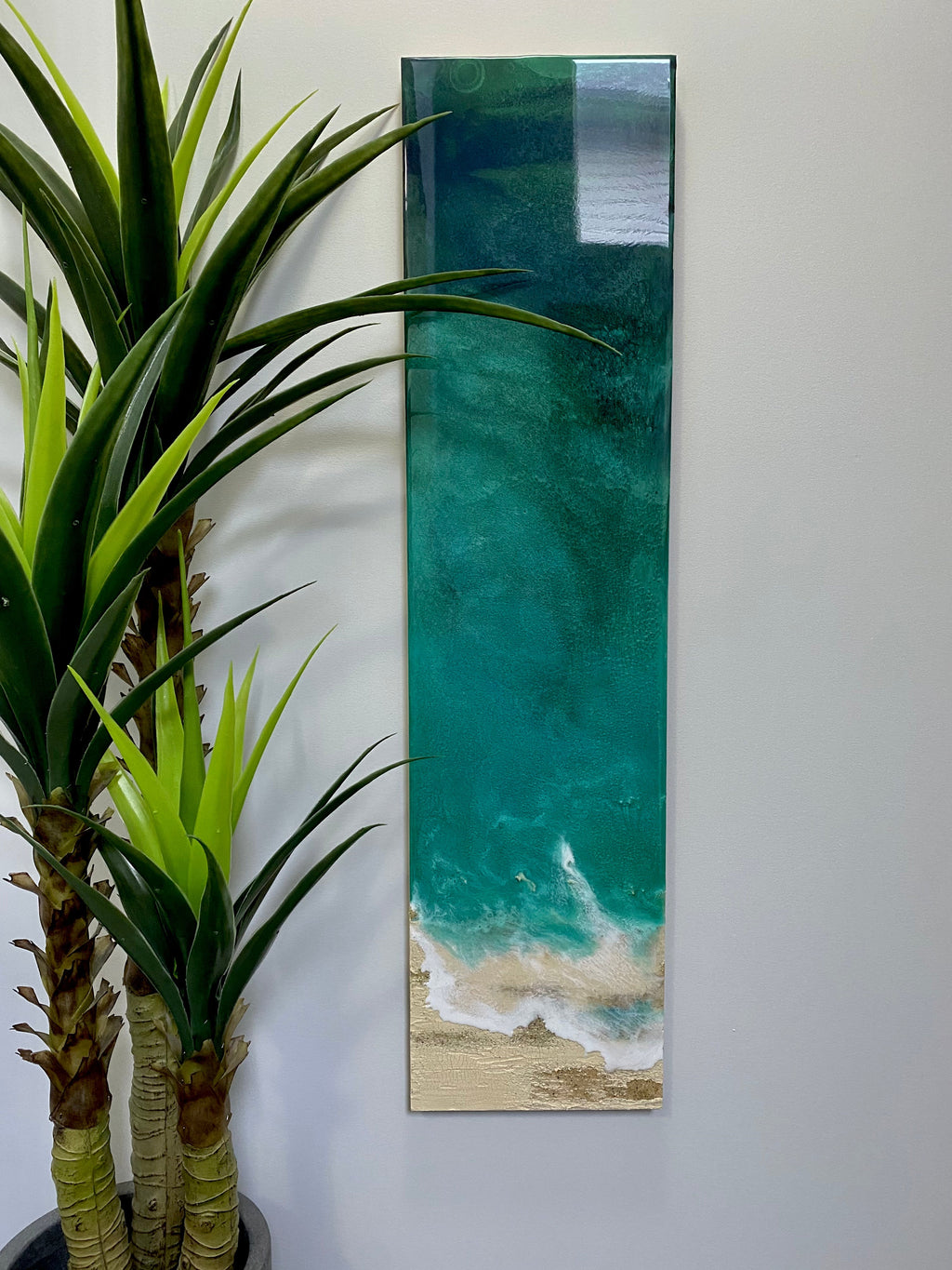 Experience the tranquil beauty of “Long Beach,” a resin artwork on birch panel. Featuring a stunning blend of teal, green, and emerald, this piece is accented with crushed walnut and recycled glass, capturing the essence of ocean waves gently lapping against the shore. Handmade with care, this 50"x12" artwork is perfect for home décor, office spaces, or as a unique gift.