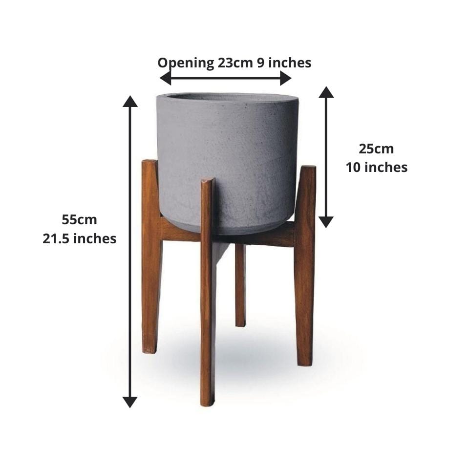 Modern Mid-Century Design: Sleek grey cement planter paired with a sturdy wooden stand for a timeless aesthetic