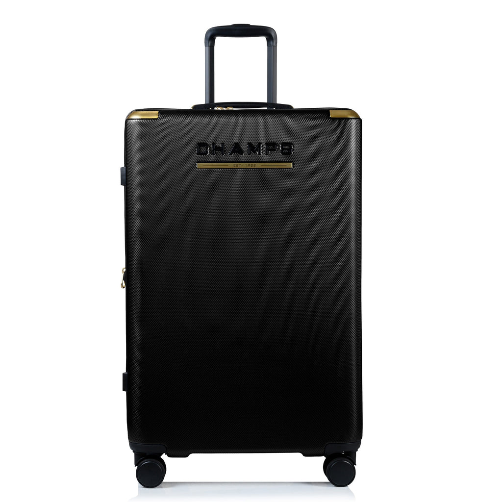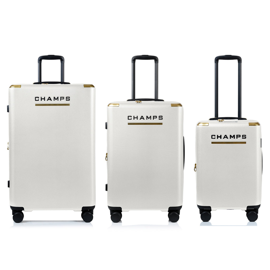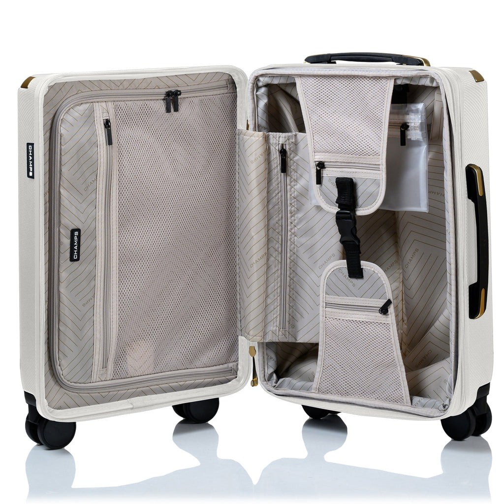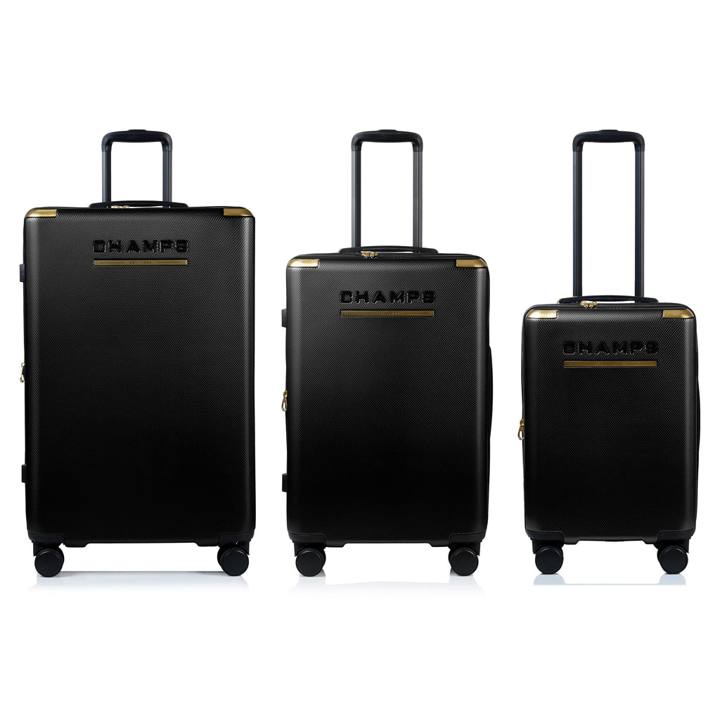 Additional Features: Built-in USB port (Carry-on), multiple storage pockets, gold accents, corner protectors