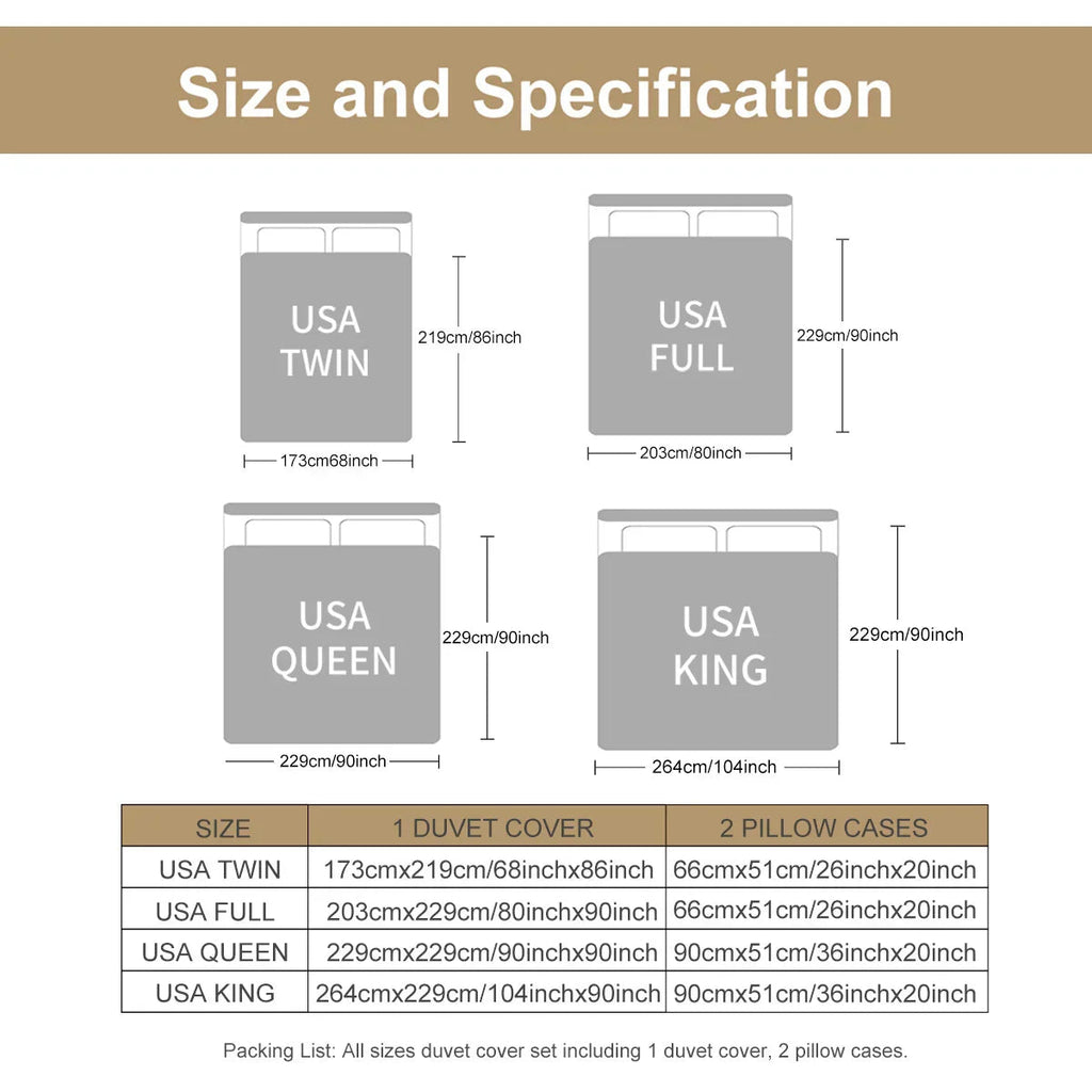 Twin Size: Duvet Cover 68" × 86", Pillow Sham 20" × 26"
