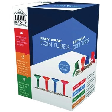 The Nadex Coins™ Easy-Wrap 4-Coin Tube Set with Coin Roll Wrappers provides a simple and efficient way to organize and wrap your coins. This set includes four coin tubes designed for quick and easy coin wrapping, along with coin roll wrappers for secure storage. Made from durable materials, the tubes are built to last while keeping your coins organized by denomination. Perfect for businesses, banks, or home use, this set helps streamline coin sorting and wrapping, making it easier than ever to manage your coin collection.