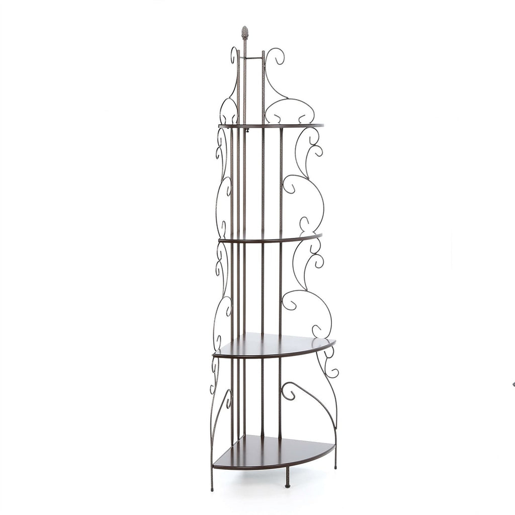 Add elegance and functionality to your kitchen or dining area with the Ornate 4-Tier Metal Corner Bakers Rack. Perfect for maximizing corner space, this stylish and practical shelf is designed to offer ample storage while enhancing your room's décor.
