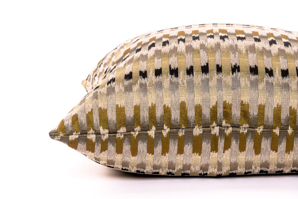 Add warmth and elegance to your home décor with the Oro Pattern Cushion Cover, featuring a vibrant mix of browns and golds in a striking Ikat weave design. Perfect for enhancing a sofa, armchair, or bed, this cushion cover combines rich tones with a luxurious texture. Made from a durable polyester-cotton blend and finished with a stylish gold-toothed zipper, each piece is hand-made in Canada for superior craftsmanship.