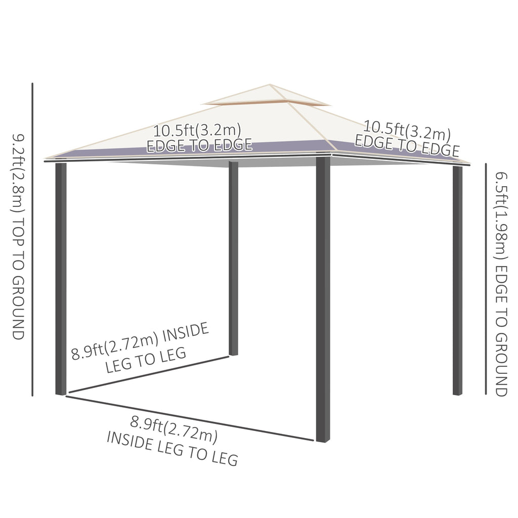 Create the perfect outdoor retreat with this 10.5' x 10.5' patio gazebo. Featuring a stylish double-tier roof with eaves, this gazebo is ideal for residential settings such as decks, patios, parks, and backyards. The vented canopy, designed in a contrasting beige and brown color scheme, provides a unique look while offering enhanced protection from the sun and light rain. The double polyester roof comes with a water-resistant and UV-fighting PU coating, ensuring durability and comfort in varying weather conditions. With built-in grommets for proper water drainage, this gazebo keeps your outdoor space dry and pleasant. The top connector hook is perfect for hanging lighting or decorations, adding a personal touch to your outdoor gathering space. Additionally, the top-mounted ventilation allows airflow, preventing the gazebo from becoming too hot and helping keep pests at bay.