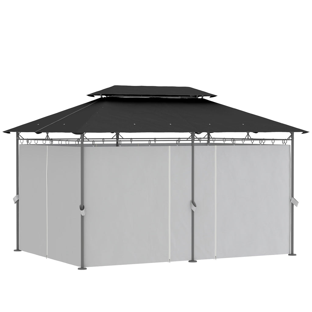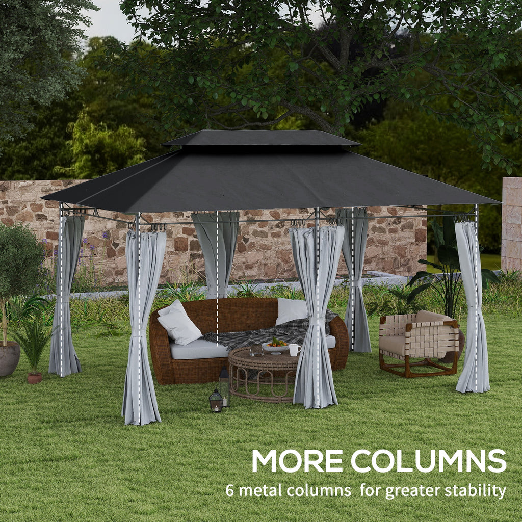 Enhance your outdoor space with this 10' x 13' soft-top gazebo, designed for exceptional ventilation, sun protection, and durability. Its two-tier roof design improves air circulation while minimizing heat buildup and wind stress. With eight built-in drainage holes, this gazebo prevents water accumulation, ensuring long-lasting performance. The heavy-duty powder-coated metal frame, supported by six sturdy columns, provides stability and weather resistance. Secure it with stakes or screws through the reinforced foot holes for added support. Featuring six removable curtains, this gazebo offers customizable sun protection and privacy, transforming your backyard into a versatile, shaded retreat. With a spacious 130ft² coverage area, it comfortably accommodates up to 12 people, making it ideal for gatherings, patio lounging, or a hot tub enclosure. Assembly requires three people.