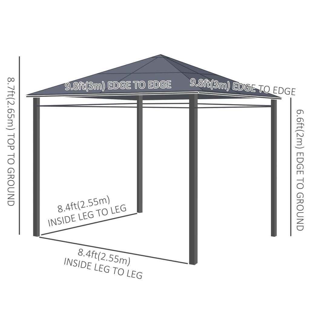 Dimensions: 9.8'L x 9.8'W x 8.7'H (300 x 300 x 265 cm).