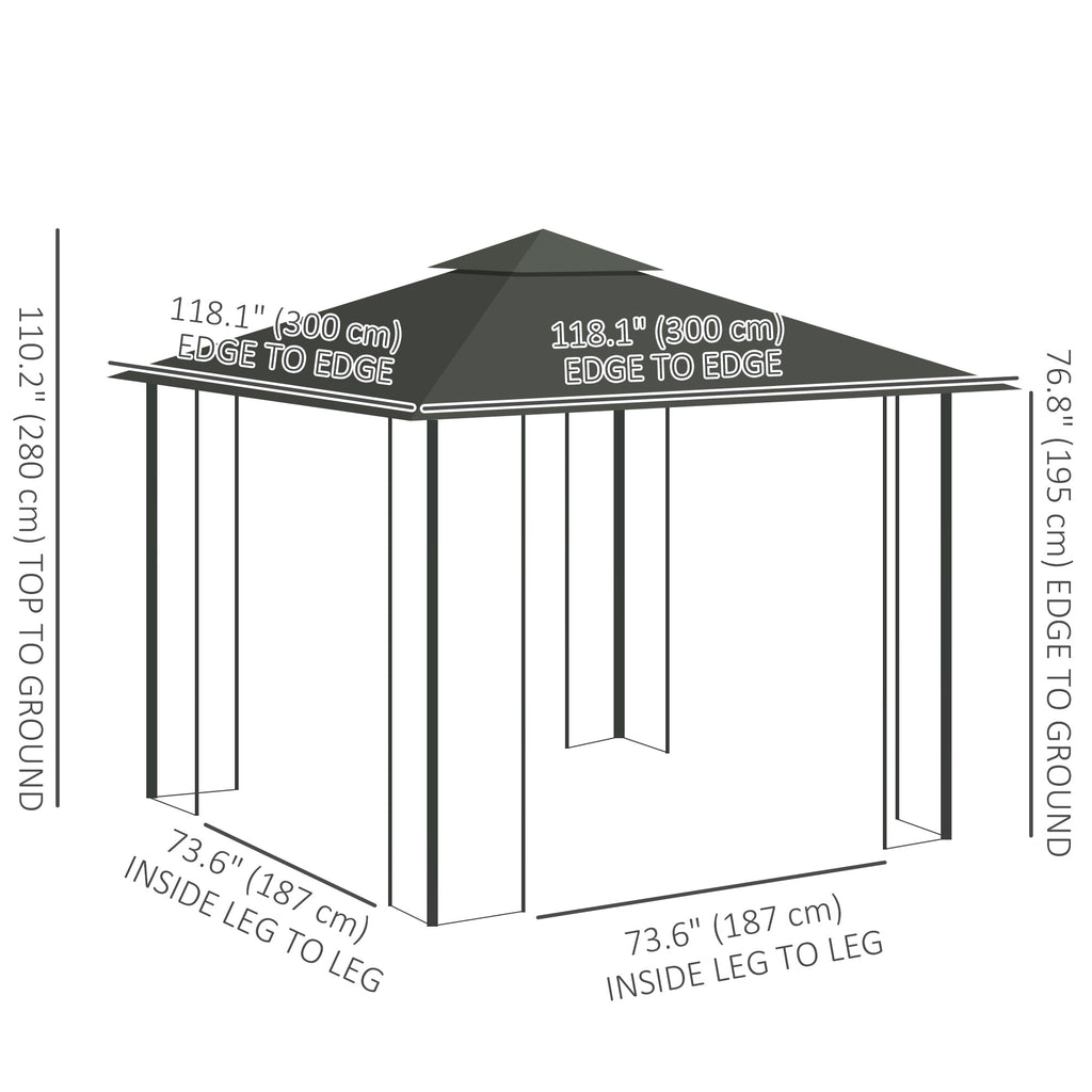 Spacious Dimensions: Overall: 9.8' L x 9.8' W x 9.2' H (3 x 3 x 2.8 m), Eave Height: 6.5' H (1.95 m).
