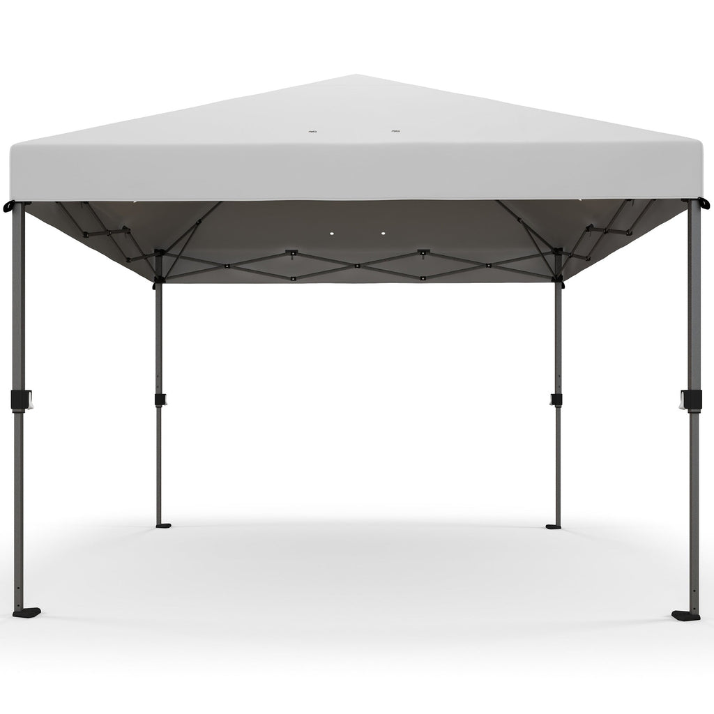 Enjoy reliable shade and protection with this 10x10ft pop-up canopy, designed to comfortably accommodate 6 to 9 people. Perfect for backyard gatherings, camping trips, cookouts, and outdoor events, this portable gazebo features a durable Oxford fabric canopy with UV 30+ protection, shielding you from the sun's harsh rays. The powder-coated steel frame withstands wind, rain, and extended outdoor exposure. Eight drainage holes prevent water accumulation, while ground stakes, spiral stakes, guy ropes, and sandbags keep the structure secure on soft ground. The push-button height adjustment offers three levels of customization, making it easy to adapt to different settings. A central button design allows for effortless setup and takedown by just one person. When not in use, store and transport it conveniently in the wheeled carrying bag. For safety, always use the included securing accessories and take the canopy down in extreme weather conditions.