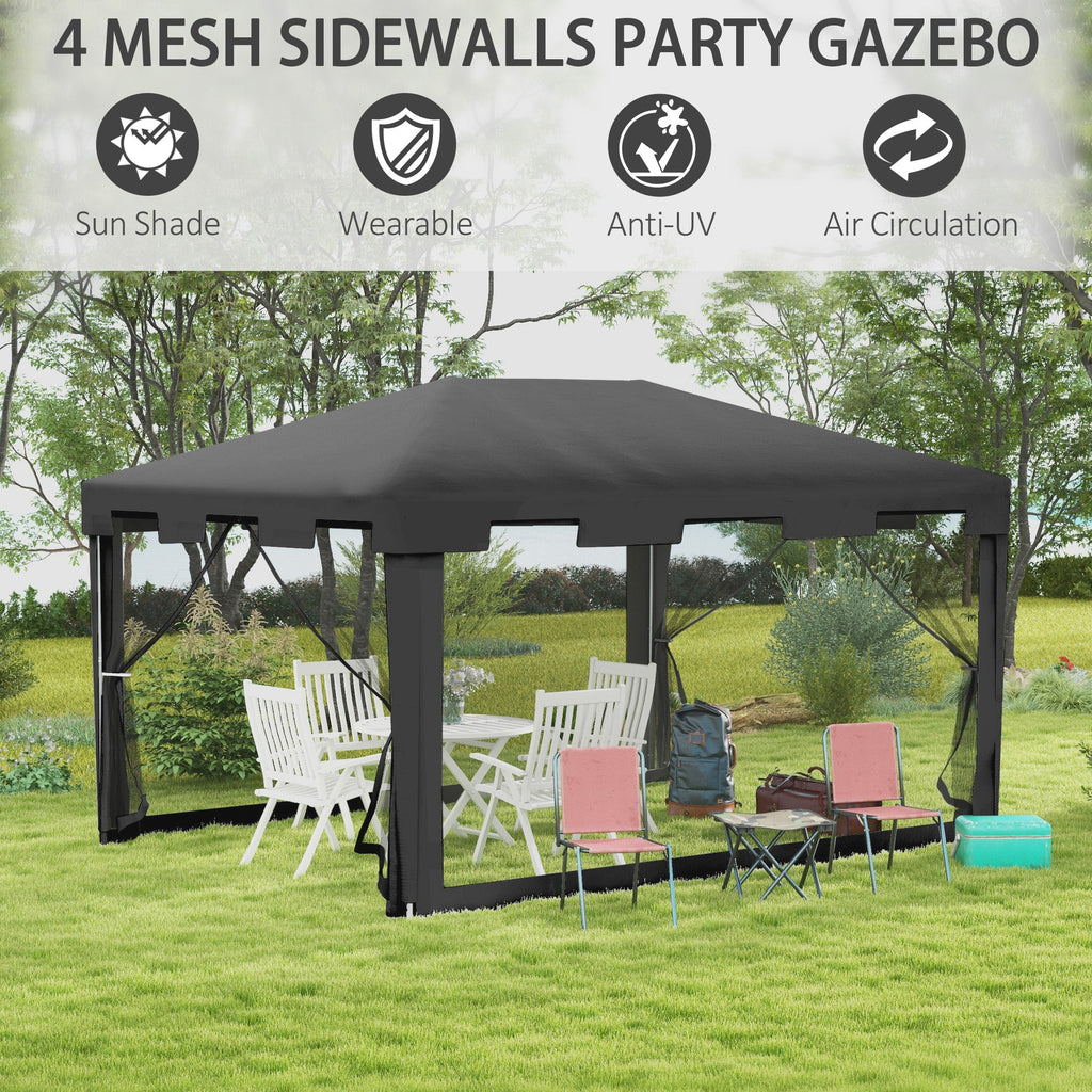 Enhance your outdoor events with this 10' x 13' event tent, built for durability and convenience. Featuring a powder-coated steel frame, this sturdy structure resists rust and corrosion, ensuring long-lasting stability. The single-piece frame design simplifies setup for a hassle-free experience. Made from weather-resistant PE fabric, the canopy top effectively shields against harmful UV rays and unwanted weather elements, while remaining easy to clean. Designed with removable zippered entrances and sides, this tent promotes ample airflow and natural light, creating a bright, open-air atmosphere perfect for parties, BBQs, and gatherings. Comes complete with 4 ropes and 8 stakes for enhanced stability in outdoor settings.