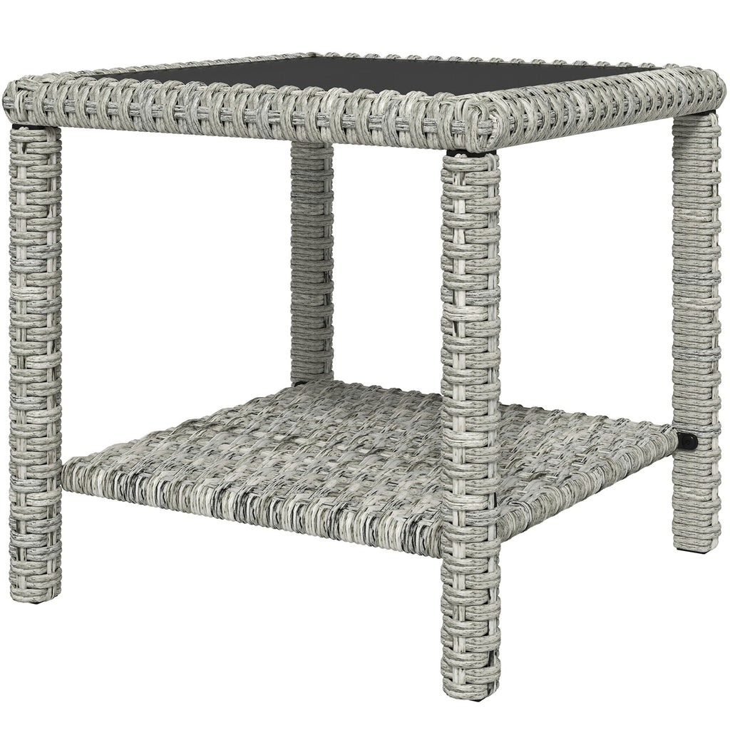 Elevate your home or garden decor with this elegant rattan outdoor coffee table, designed to seamlessly blend into both indoor and outdoor settings. Featuring a sleek and stylish rattan design, this coffee table adds a touch of sophistication to your patio, living room, or any space. It comes with a stable 0.2" (0.5 cm) tempered glass top that not only enhances the table's durability by resisting impacts and scratches but also makes cleaning a breeze with a simple wipe-down. The coffee table offers a convenient double-layer shelf, perfect for storing daily essentials like books, magazines, or remote controls, helping keep your space tidy and organized. Built with a powder-coated steel frame, this table ensures long-lasting stability and durability, with protective feet for added support. Whether you're hosting guests on your patio or enjoying a cozy evening indoors, this table provides both functionality and style.